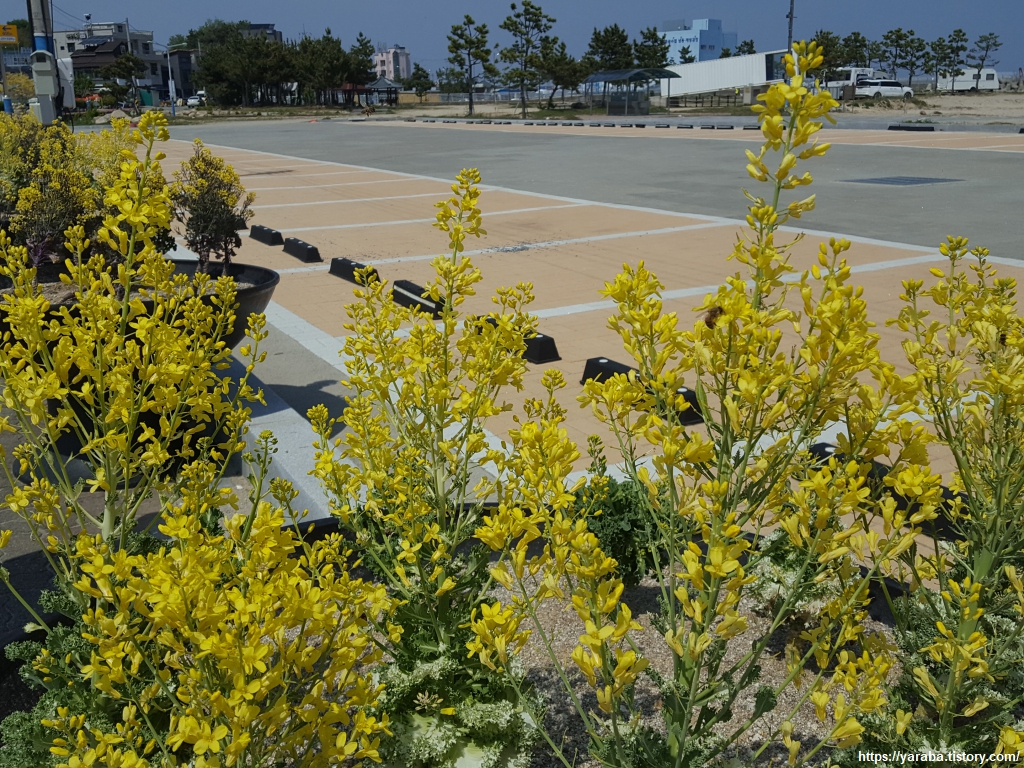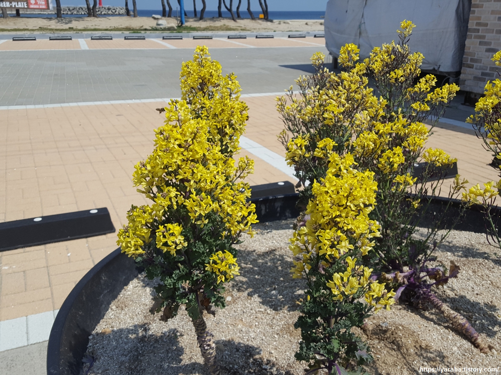 화단의 노란 꽃은 과연 무엇일까? 한 겨울에도 다양한 색상으로 해변을 장식했을 꽃양배추다, 꽃배추, 잎모란이라고도 불리는 북유럽 원산의 배추과 식물이다. 초록잎 안쪽으로 흰색, 보라색, 붉은색 등의 잎이 나와서 마치 꽃처럼 보이지만 그것은 잎일 뿐이지 꽃은 아니다. 배추처럼 5월에서 6월 사이에 진짜 노란 꽃을 피운다.