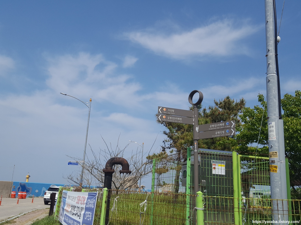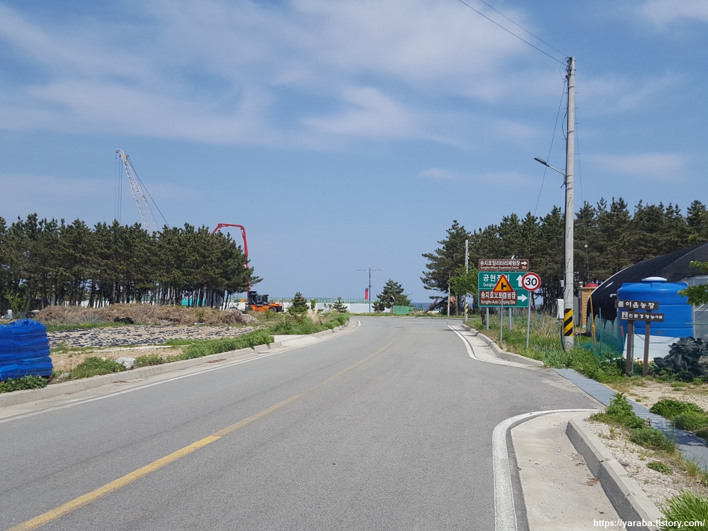 공현진 해수욕장을 빠져나와 해수욕장 입구에서 우회전하여 가진 해변길 도로를 따라 걷는다.