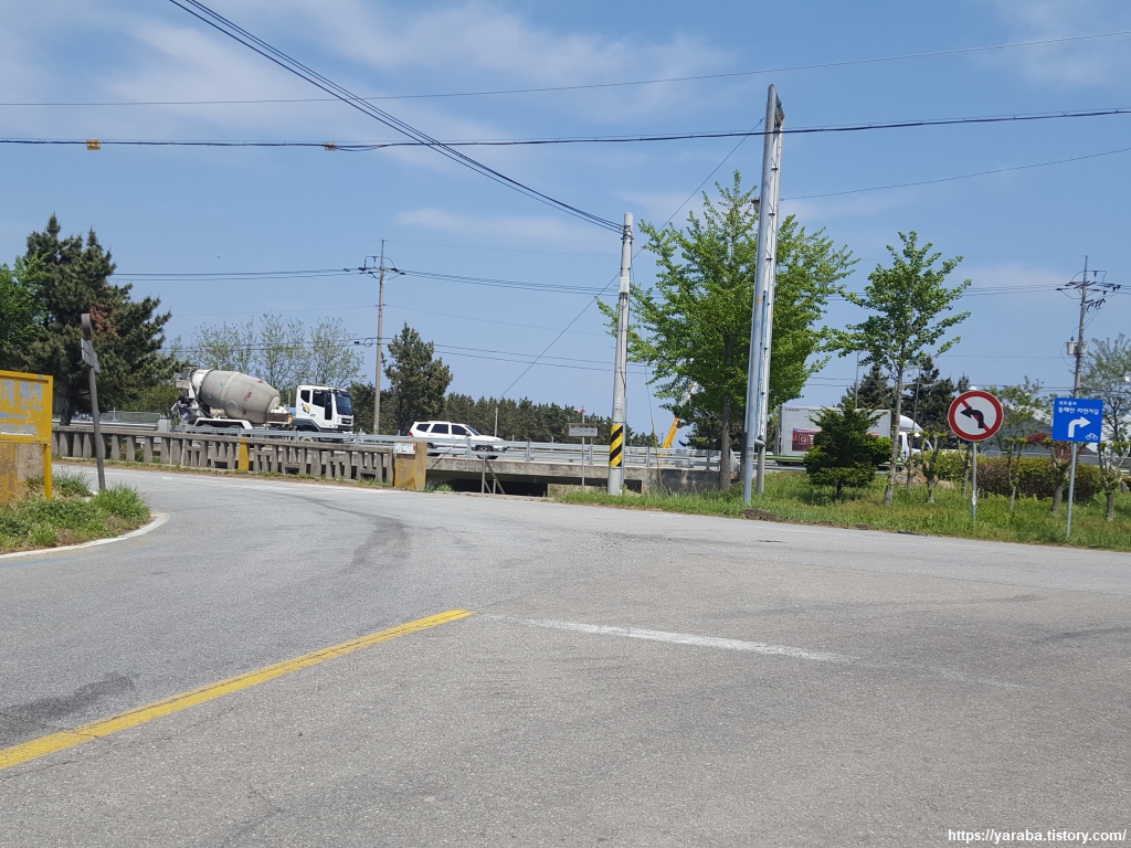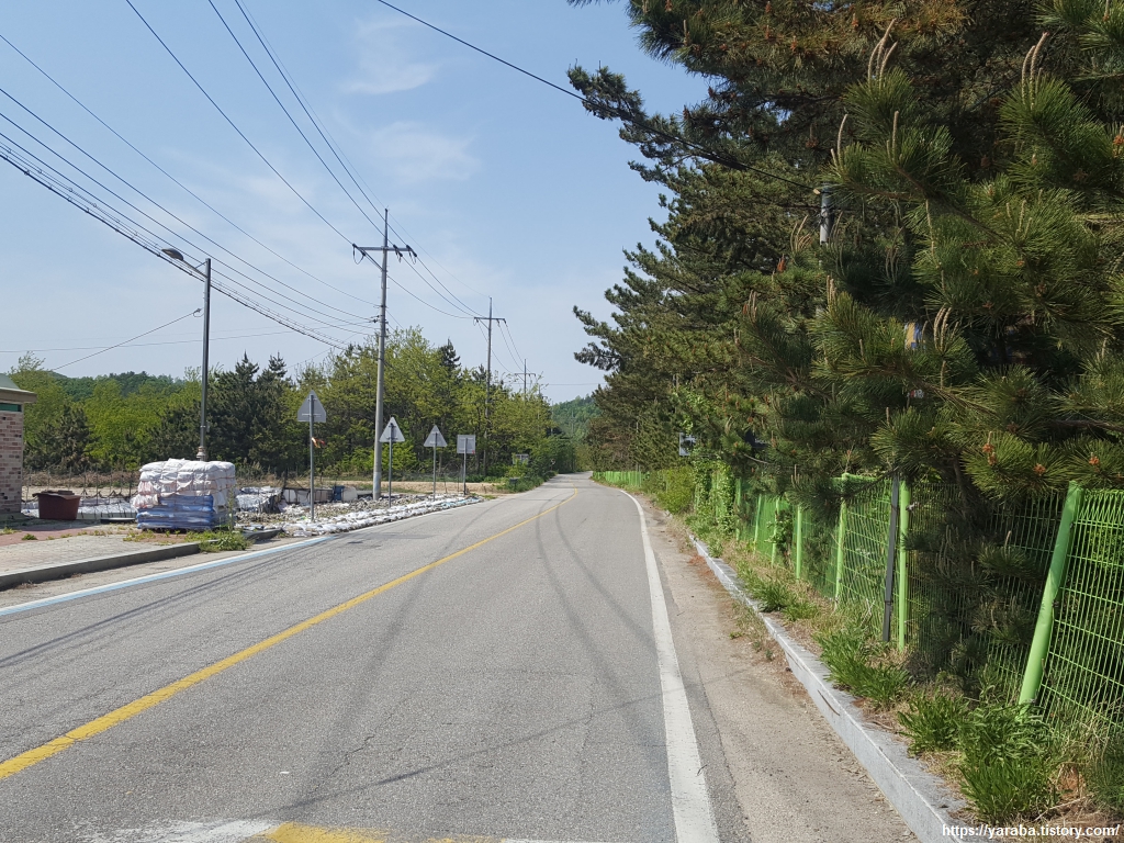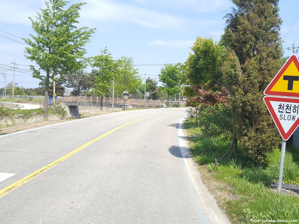이곳은 자전거에게도 도보 여행자에게도 그리 녹록지 않은 길이다. 도로변으로 여유 공간이 별로 없어서 차량들이 우리를 배려해 주기를 바랄 뿐이다. 여름이면 붉은 꽃으로 존재감을 뽐낼 길이지만 지금은 낭만가도 배롱나무 가로수길이란 표지판만이 그 존재를 알리고 있다.