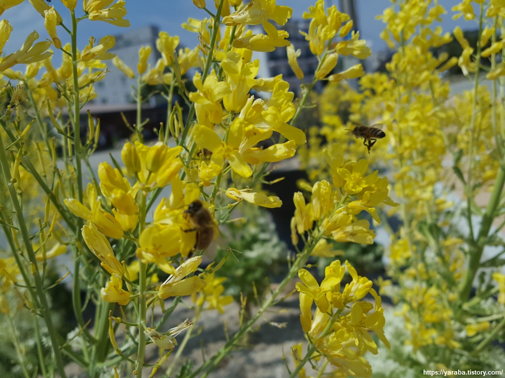 사람들은 외면하는 꽃양배추의 노란 꽃에 꿀벌들이 날아들어 신이 났다.