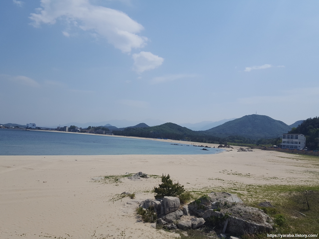 아쉬움이 가득한 마음으로 가진항으로 가는 길, 공현진리에서 가진리로 넘어간다. 해변의 바위와 백사장이 어우러진 풍경은 일품이다. 바위들이 큰 규모가 아님에도 나름의 멋을 자아낸다. 그렇지만 그늘 없는 해변가에 내리쬐는 땡볕은 46코스, 47코스를 이어 걸은 우리의 발걸음을 너무 무겁게 한다.