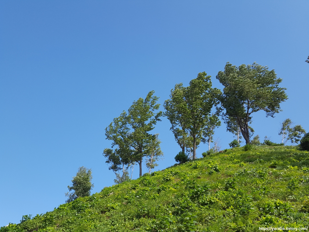 마산 해안교를 넘어서 우회전하면 북천변을 따라 송죽리 해안으로 산책길로 갈 수 있지만 해파랑길은 좌회전하여 마산 아래를 돌아간다. 풀이 덮인 작은 동산에 활엽수들이 서있는 풍경이 나름의 멋을 자아낸다.