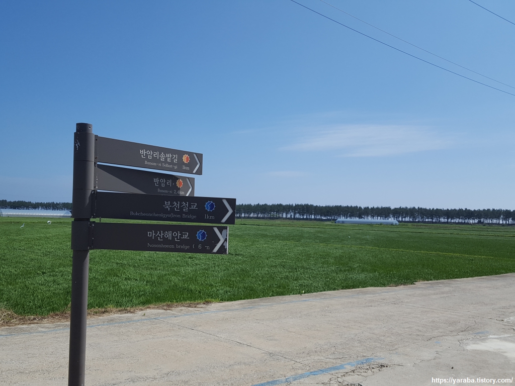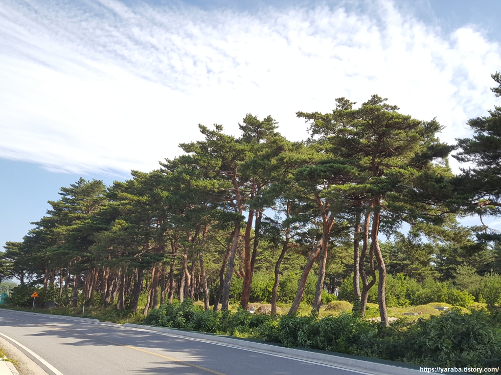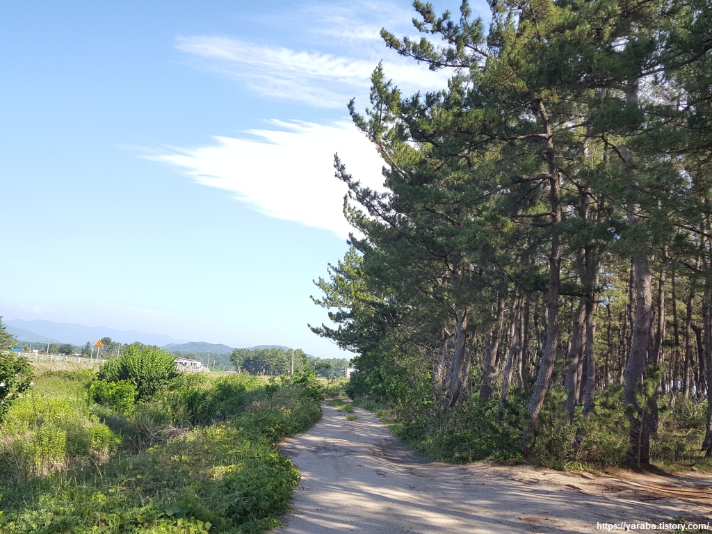 솔숲만 보다가 푸른 초원 위의 자작나무를 보니 이국적으로 느껴지는 모양이다. 겨울에는 조금 황량하게 보일 수도 있지만 지금은 훌륭한 풍경을 보여주고 있다. 마산을 돌아 나오면 우회전하여 해안으로 이동한다. 이제 반암리 솔밭길을 걷는다.