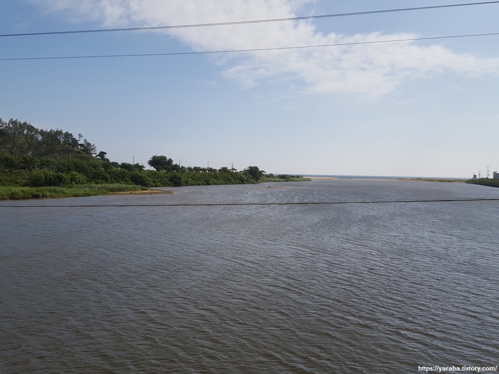북천 철교를 건너면서 바라본 상류와 하류의 모습이다. 상류로 보이는 다리는 7번 국도가 지나는 북천 1교다. 진부령에서 시작해서 동해로 흘러가는 북천이 강한 바람 탓인지 상당히 넓어 보인다.