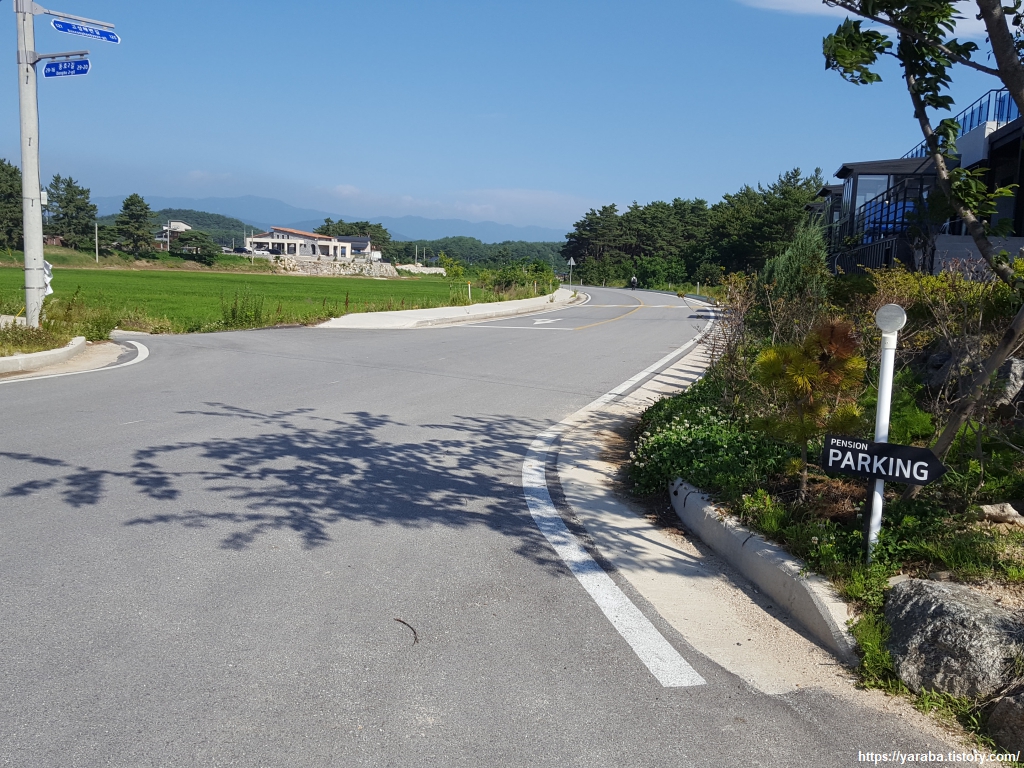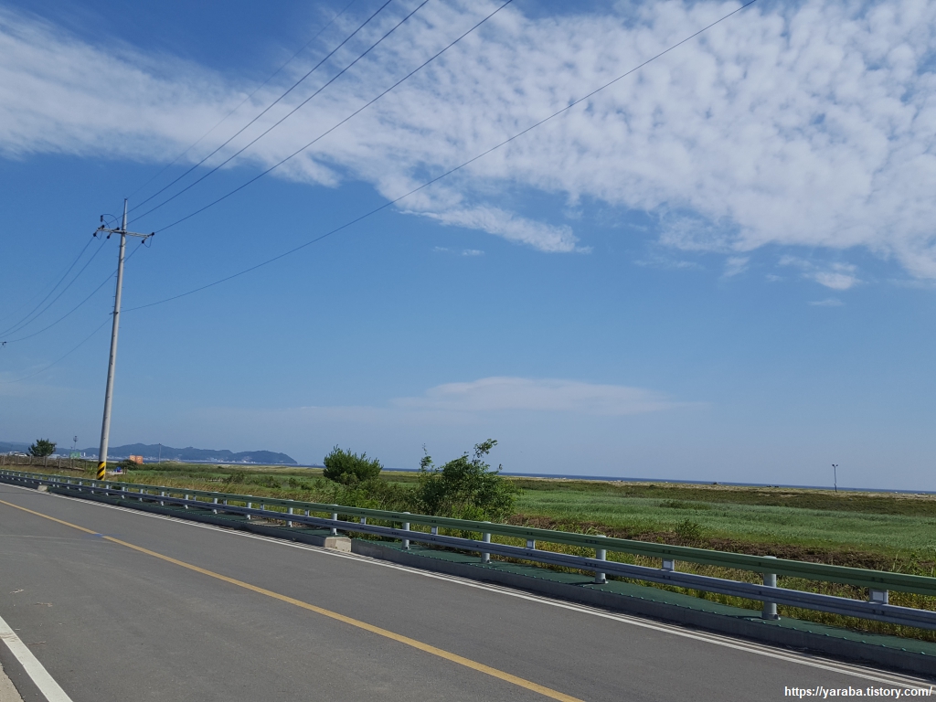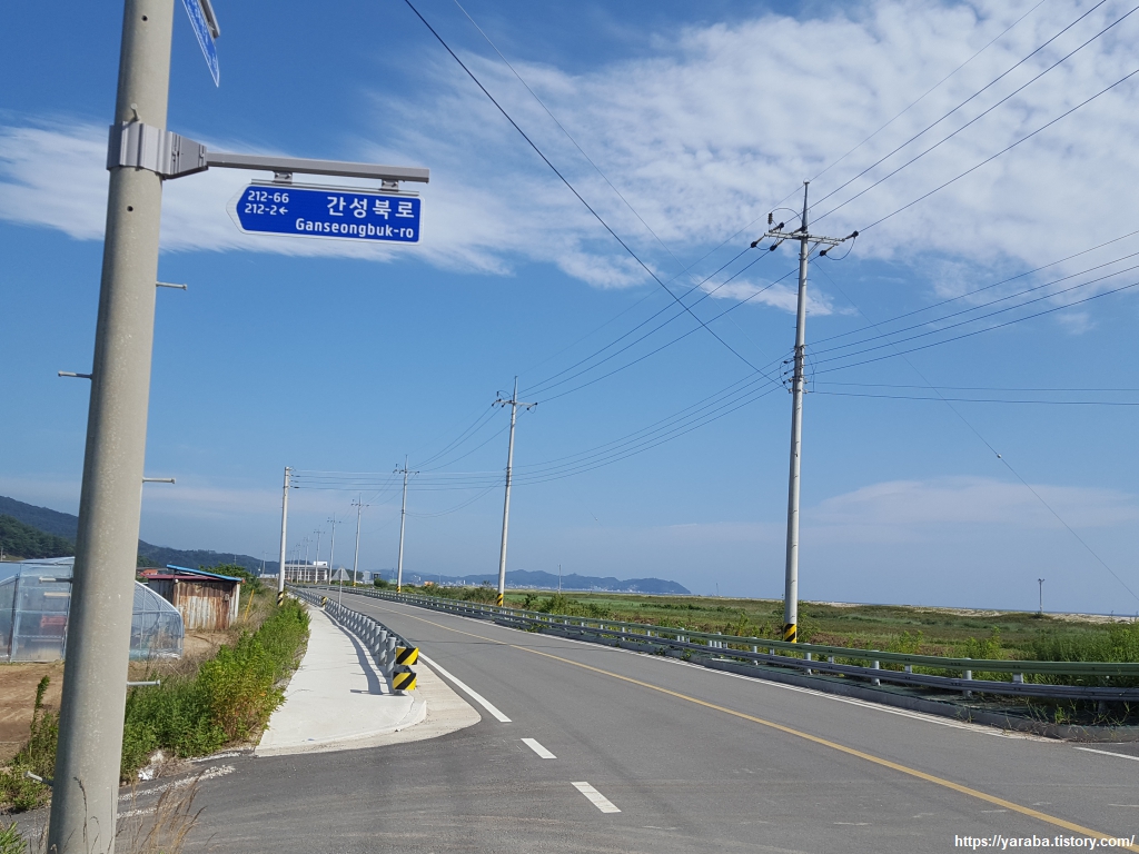 솔숲을 벗어나 동호 1길 도로로 나오면 넓은 간성의 들판을 걷는다.