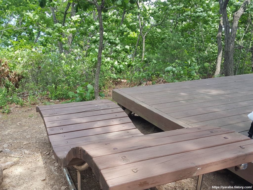 소나무 숲 산림욕장이라 그런지 중간중간 쉼터들이 넉넉하게 마련되어 있는데 누워서 숲을 만끽하라고 침대형 벤치도 마련되어 있었다. 배낭과 신발도 벗어두고 숲 속에서 넉넉히 휴식을 취한다. 우리는 김일성 별장 쪽으로 내려가지만 그쪽에서 올라와 응봉으로 향하는 사람들도 있었다. 남자 형제들이 먼저 가고 그들의 부인들이 뒤따라 가는 그룹이 있었는데 남자들이 벤치에 앉아 쉬며 이제 다 왔나? 하니 부인들이 아직 한참 가야 합니다! 하며 여유 있는 모습을 보인다. 부인들은 길을 알고 가는 구나하는 생각이 들었다. 젊은 부부가 아이를 데리고 가는 사람들도 만났는데 이들은 두 사람 모두 길에 대한 정보가 없는 모양이었다. 김일성 별장 지나 조금만 가면 되나 보다 하는 모양이었다. 아직도 한참을 가야 하는데, 힘드니 아이 데리고 가지 말라고 할 수도 없고, "아직 한참 더 가야 합니다." 했더니 아무런 정보가 없던 상황에서 길을 열어준 모양새가 되어 고마워하는 눈치였다.