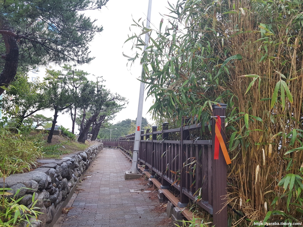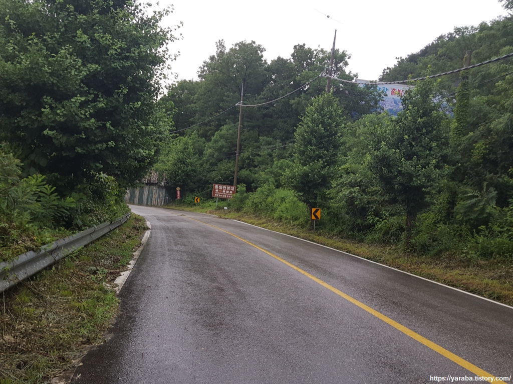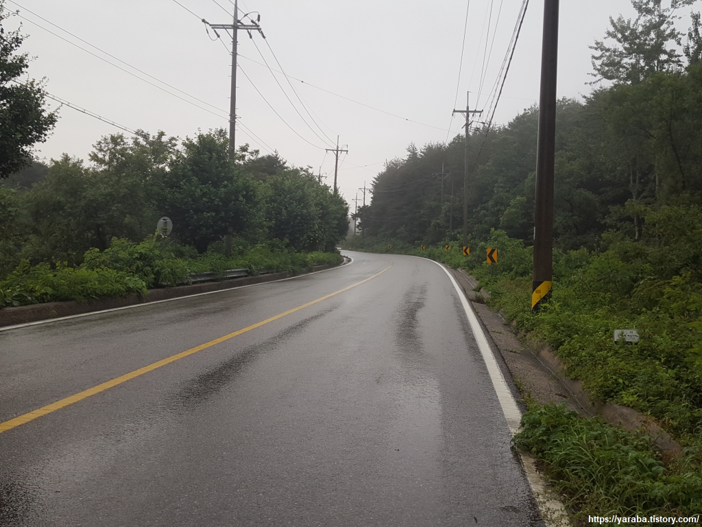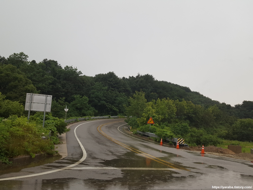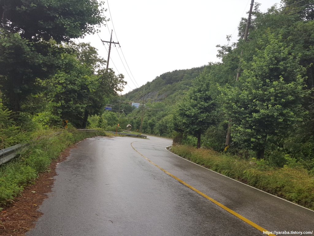 빗줄기가 굵어져서 들리는 소리는 우산에 떨어지는 빗소리와 발자국 소리, 스마트폰에서 끊임없이 재생되고 있는 음악소리뿐이다. 명파리 버스 시간을 맞추어 보겠다는 일념으로 빗속에서도 큰 걸음으로 힘을 내본다. 차량이 많이 없어서 다행이지 걷기에 안전한 길은 아니다. 사각지대가 생기지 않도록 방향을 바꾸어 가며 걷는다. 지금의 해파랑길이 산으로 경로를 바꾼 이유를 이해할만하다.