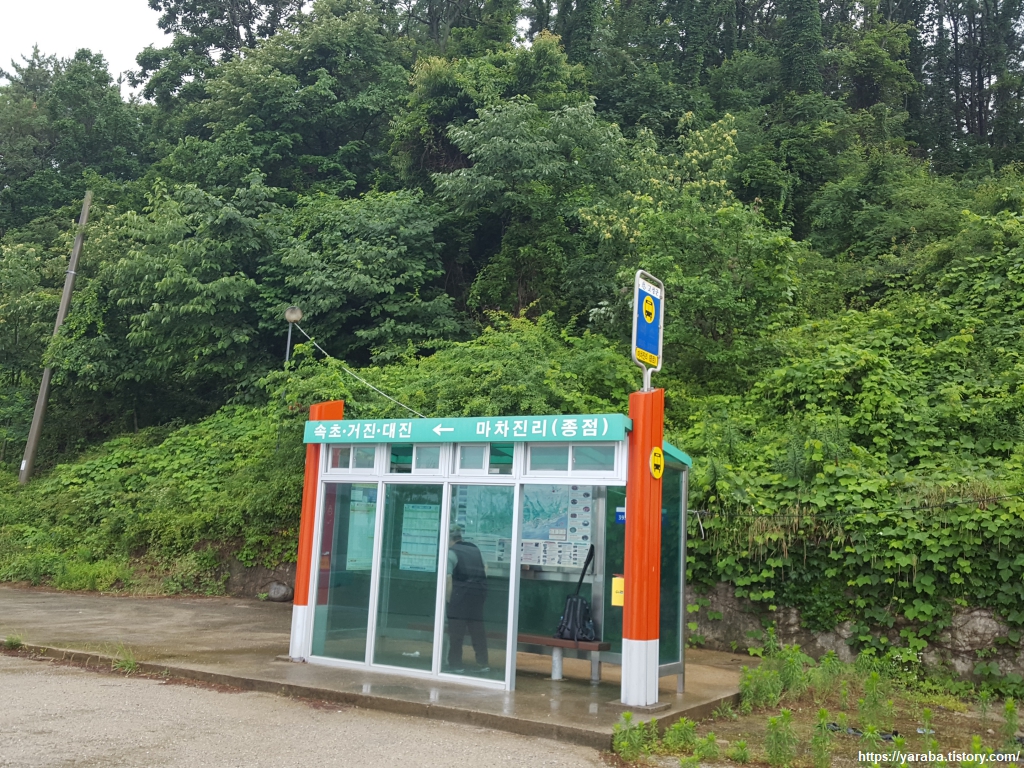 미니 버스를 탄 우리는 여정을 끝낸 기쁨으로 신발부터 모두 젖어버린 피곤마저 잊어버린 채 들뜬 마음으로 마차진리 버스 종점에서 버스를 내렸다. 그런데 버스의 안내 방송도 종점이라고 했는데 기사 아저씨가 대진항까지 가는 분이 있냐고 물으신다. 우리와 함께 버스를 탔던 또 다른 해파랑길 여행자는 대진항까지 가셨다. 우리는 시내버스를 기다렸다가 시내버스로 간성 터미널로 이동하여 동서울로 가는 버스를 탔는데 간성 터미널에서 천천히 생각해 보니 그분처럼 대진항으로 가는 것도 좋은 방법이다 싶었다. 시내버스로 간성 터미널까지 가는 시간이 한참 걸리는 문제도 있고, 서울 가는 버스 티켓의 우선권이 대진 터미널에 있기 때문이기도 하다. 처음에는 한 사람만 좌석이 확정이고 한 사람은 좌석을 알 수 없다고 했다. 나중에 좌석을 나란히 갈 수 있도록 바꿔주기는 했지만, 이런 이유는 대진 터미널이 아직 전산화가 되지 않아서 생기는 문제란다. 대진항에서 대진 시외버스 터미널까지 1km 정도이니 걸어가도 좋을 거리였다.