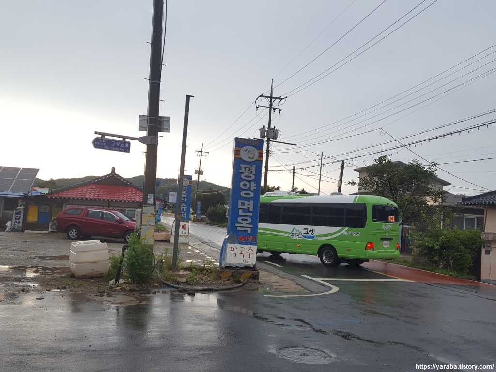 대진 1리에서 마차진리 넘어가는 경계에는 고성군 시내버스 종점이 있다. 이곳에서 명파리로 가는 미니 버스가 대기 중이다. 나중에 명파리에서 저 버스를 타고 나올 예정이다. 시간이 맞지 않으면 한참을 기다려야 하므로 시간을 잘 맞추어야 한다.