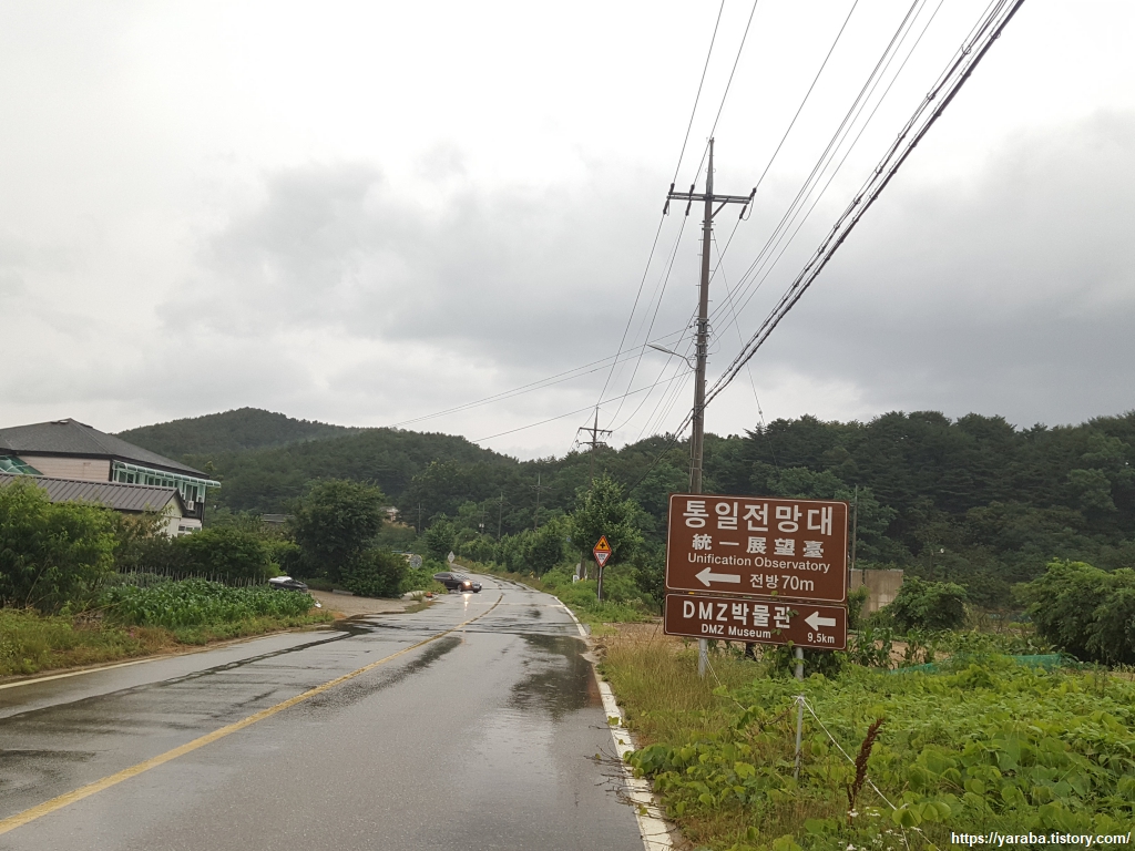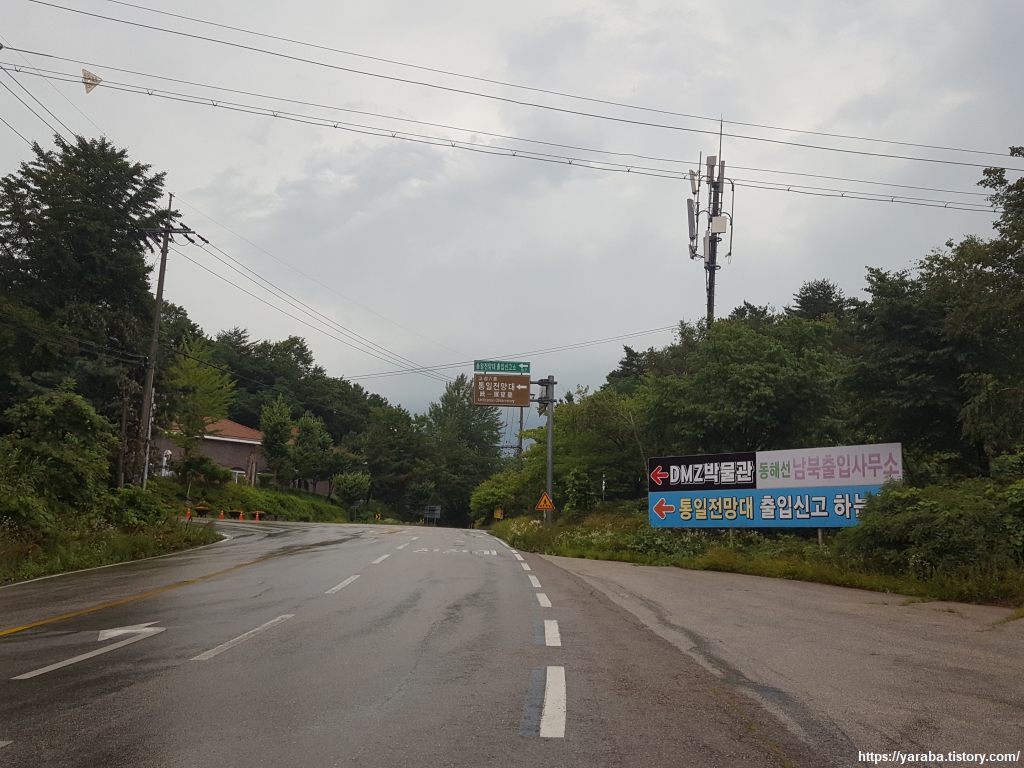 통일 전망대로 가시는 분들은 대부분 이 표지판에서 좌회전하여 7번 국도를 타고 올라간다. 그렇지만 우리가 가는 길인 금강산로를 따라 쭉 직진해도 마찬가지로 통일 전망대로 갈 수 있다. 두 도로 모두 제진 검문소를 거치기 때문이다.