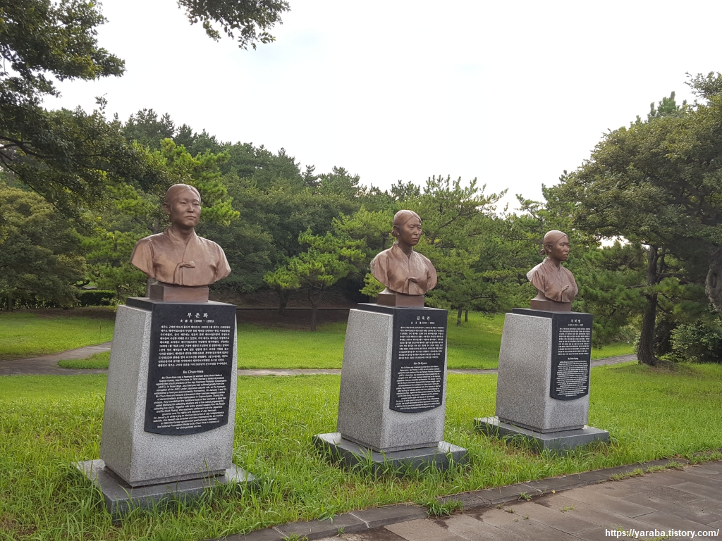 한쪽에는 2003년 대한민국 건국포장을 수여받은 부춘화, 김옥련, 부덕량 열사의 흉상이 세워져 있었다. 1931년 20대 초반의 나이였던 이분들은 모두 구좌읍 하도리 출신으로 일제의 부당한 식민지 침탈에 항거하는 시위대의 대표였다고 한다. 1천여 명의 해녀들과 함께 일본 경찰에 맞서 시위를 벌였고, 민족운동가의 검거를 막다가 체포되어 옥고를 치르기도 하셨다. 20대 초반의 꽃다운 나이에 동료들을 위해 앞장선 이 분들의 용기는 도저히 가늠하기 어렵다.