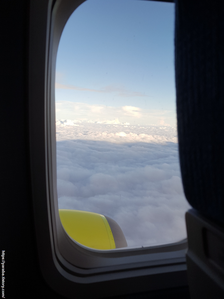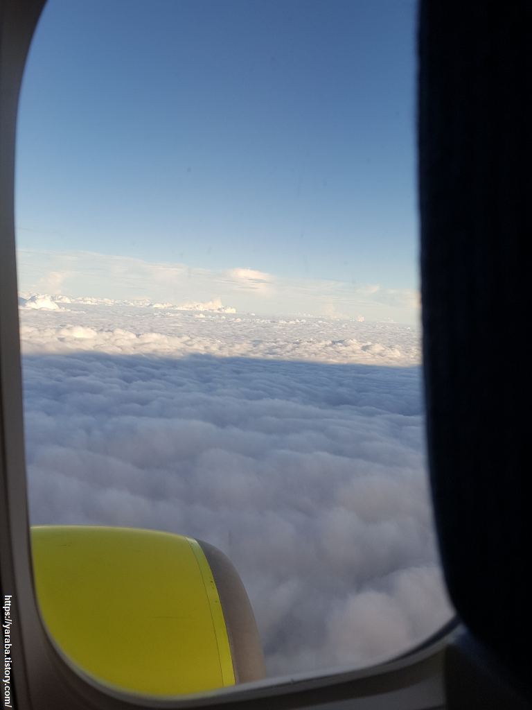 청주 공항을 이륙한 비행기는 고도를 올려 어느새 구름 위로 올라왔다. 창 밖으로 보이는 구름들이 양탄자 같은 환상적인 풍경을 만들어 준다. 어제까지만 해도 비가 그치지 않던 하늘이 오늘부터는 맑은 하늘을 보이고 있다. 청주에서 이륙하는 비행기들은 제주도로 직선으로 날아갈 것 같지만 실상은 태안 쪽으로 기수를 돌려 서해안으로 이동한 다음 군산, 광주 상공을 따라 제주도로 이동한다.