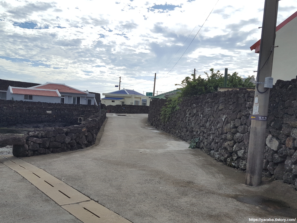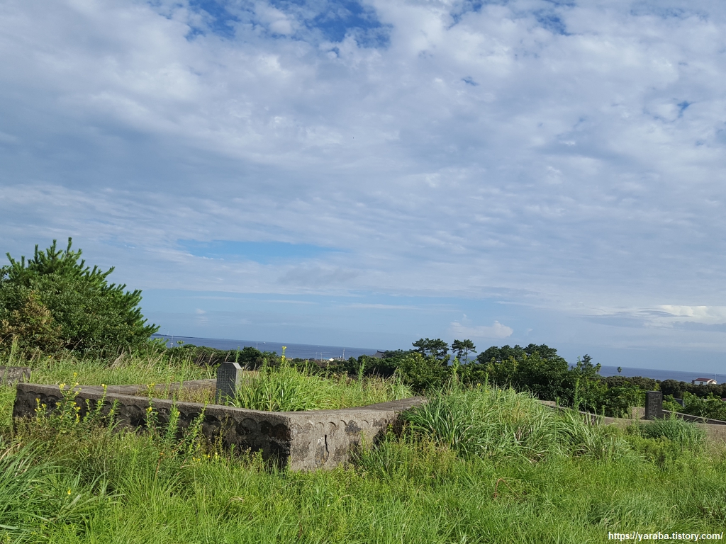 마을길을 지나며 만나는 커다란 나무는 마을의 어르신을 뵙는 것과 같은 존경심도 있고 푸근함과 정겨움도 있다. 통행에 불편하다고 나무를 싹둑 잘라내는 마을치고 좋은 마을을 보지 못했다. 하도 포구 방향으로 나아가는 길, 묘소 너머 멀리 수평선이 눈에 들어오니 이 또한 좋다. 이른 새벽의 검은 구름 대신 푸른 하늘과 흰 구름이 풍경을 채우고 있다.