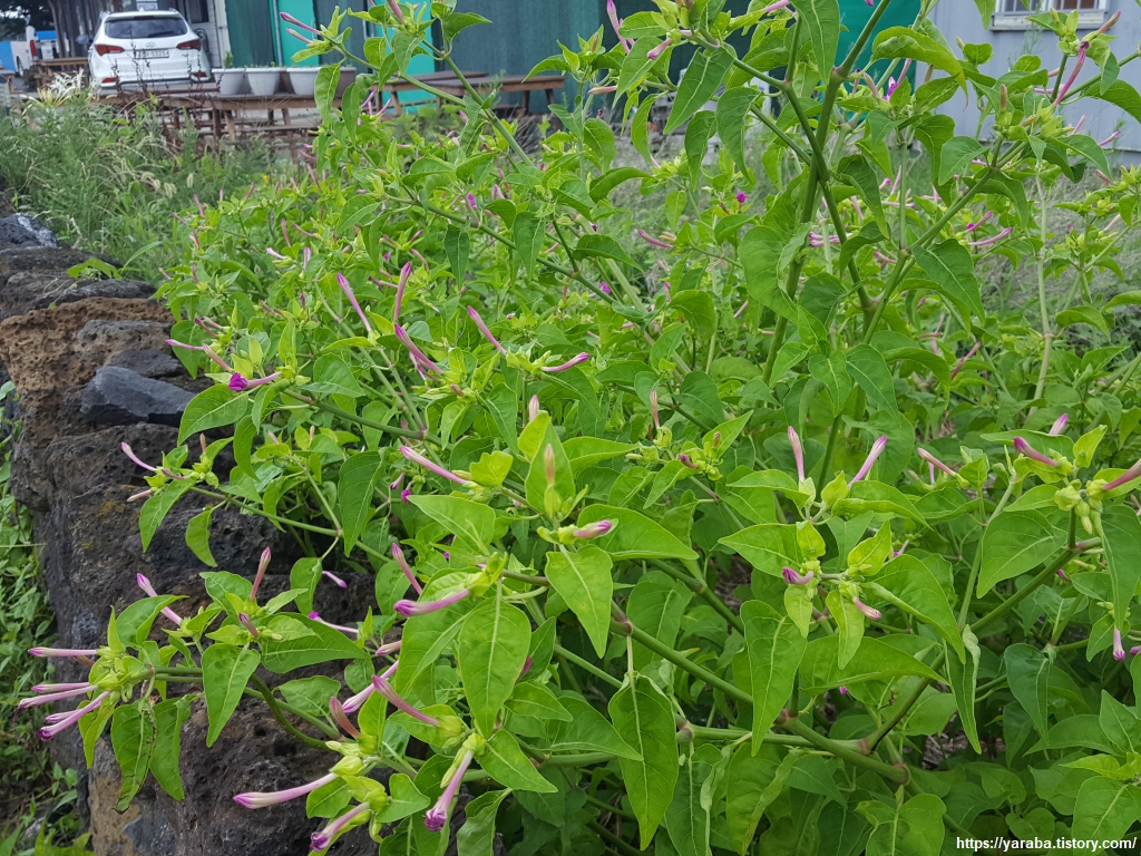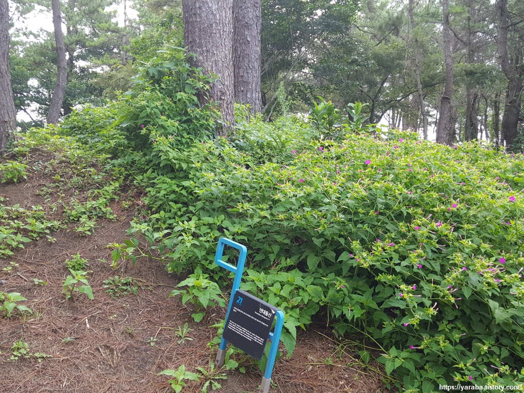 21코스 시작점으로 이동하는 길에 만난 분꽃. 꽃 모양이 나팔 모양이라 나팔꽃으로 착각하기도 하지만 나팔꽃은 꽃은 크기도 크고 분꽃과는 엄연히 구분되는 꽃이다. 특이하게 해질 무렵인 4시 정도부터 아침까지 꽃을 피우고, 낮에는 꽃이 오므라든다. 나팔꽃은 반대로 낮에 꽃을 피웠다가 저녁이면 꽃이 오므라든다. 검고 동그란 열매를 맺는데 그 안에 분가루 같은 흰 녹말가루가 있어서 분꽃이라 이름이 붙었다고 한다. 실제로 열매를 가루 내어 분으로 사용하기도 했다고 한다.