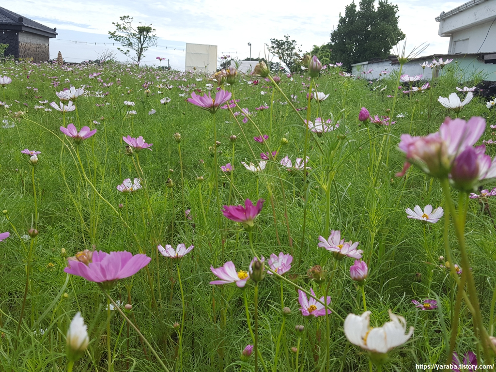 숨비 소리길 공터에 자리한 코스모스가 감성을 더해준다. 코스모스는 가을꽃이라 생각했는데, 실제로는 6월부터 10월까지 볼 수 있는 꽃이다. 살사리꽃이라는 우리말도 정겨운, 한 여름에 만나도 마냥 좋은 그런 꽃이다.