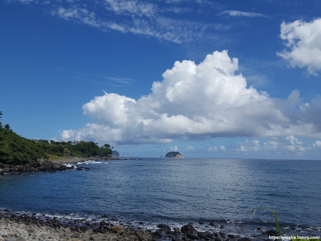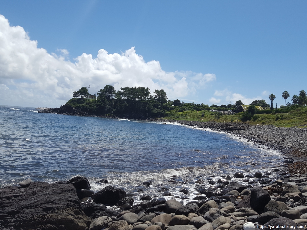 서귀포 대륜동 해안은 끝내주는 풍경화 한 폭을 우리에게 내어주고 있다. 파란 하늘, 녹음 가득한 나무, 흰구름, 시커먼 몽돌 그리고 이 모든 것을 비추고 있는 바다와 자연조명까지, 잠시 멈추어 서는 것만으로도 그야말로 걸작을 만난다.
