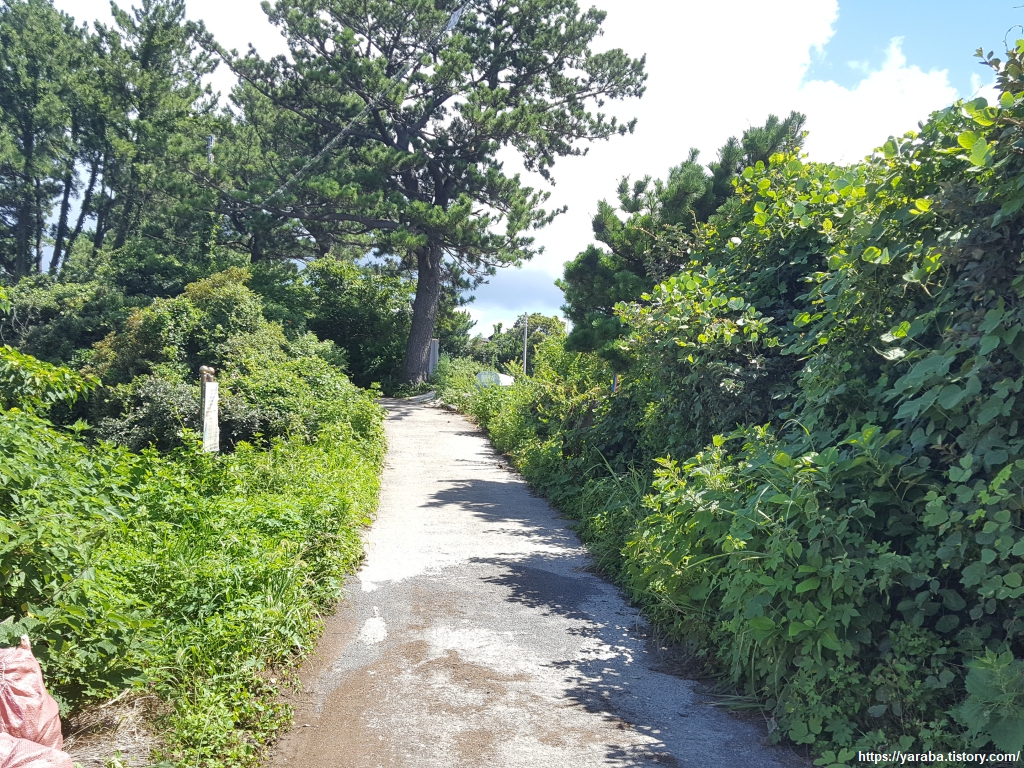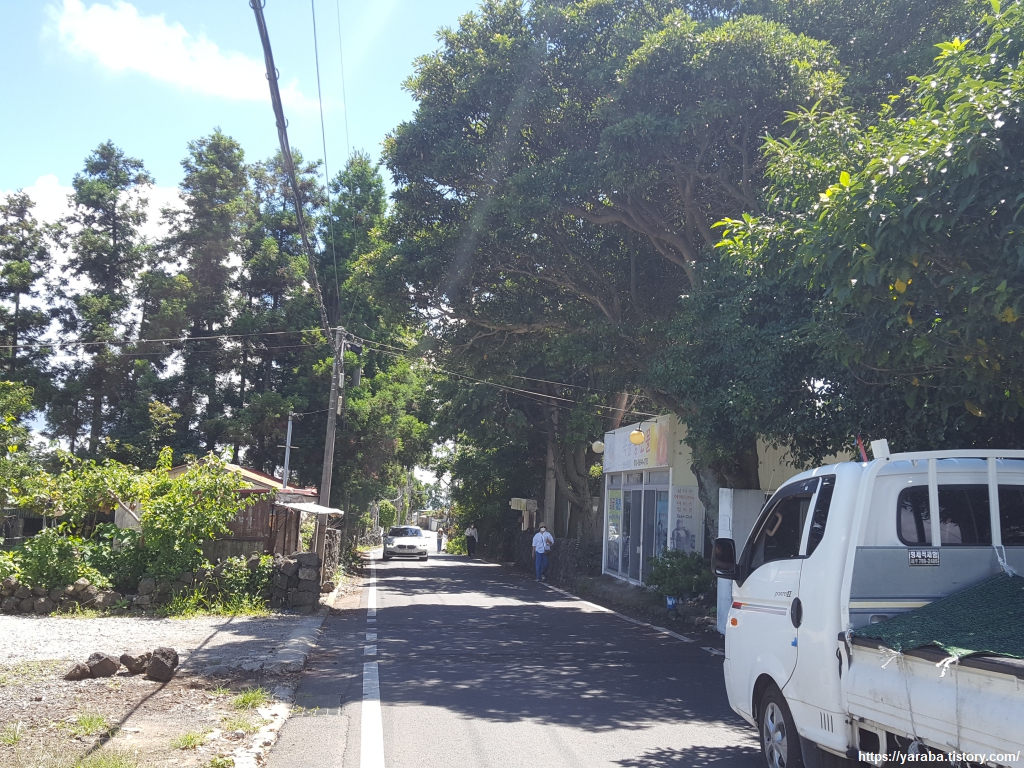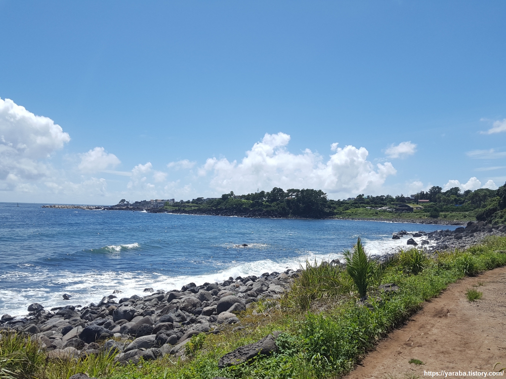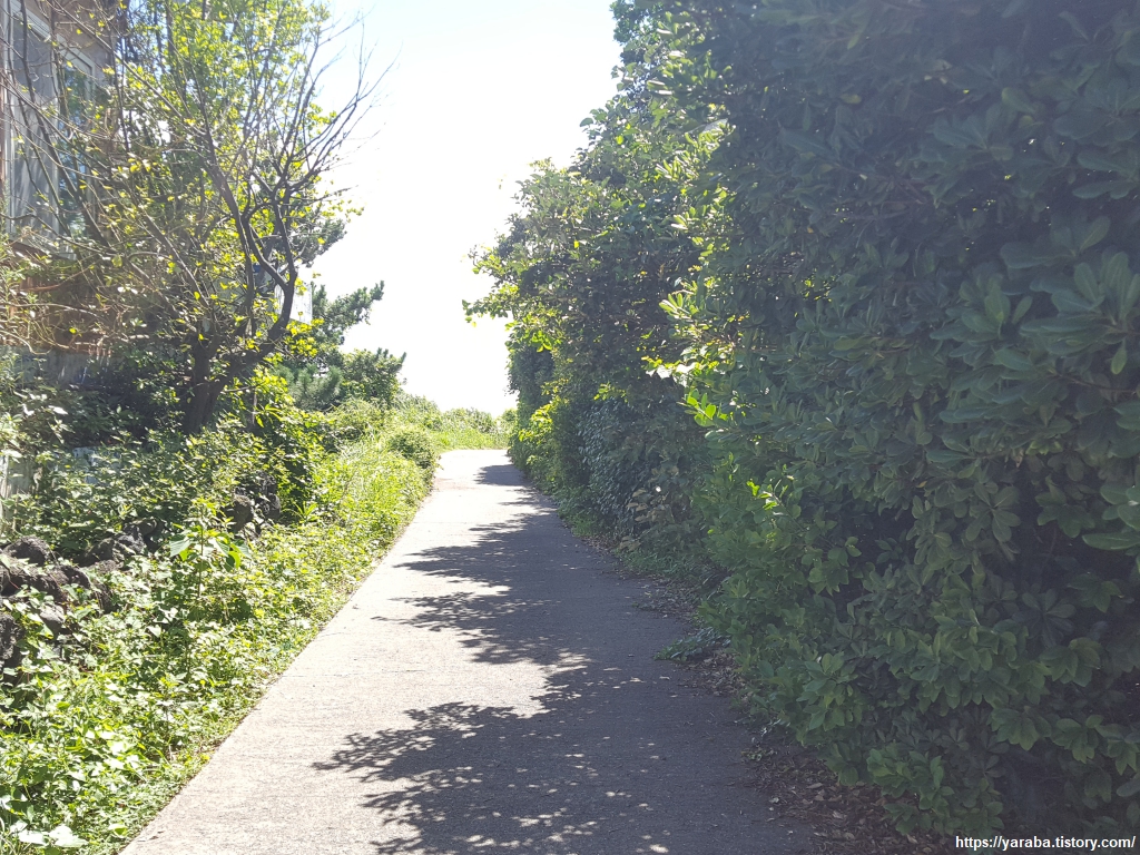 오전에 올레길 21코스를 끝낸 우리는 무더위에 파김치가 된 상태로 옆지기가 근처 편의점에서 구입한 음료수를 거나하게 들이켜고 종달 초등학교 앞 버스 정류장에서 201번 시내버스를 올라탔다. 긴 시간의 이동이니 만큼 급행을 타고 환승할까도 생각해 보았지만 조금 늦더라도 서귀포 여고까지 한 번에 갈 수 있는 방법을 선택했다. 거의 2시간에 육박하는 긴 이동 시간에 버스를 거칠게 모는 기사님 덕분에 깊은 잠을 자지는 못했지만 시원한 에어컨 바람을 맞으며 넉넉한 휴식 시간을 가질 수 있었다. 외국에서 온 것으로 보이는 두 여성이 우리 앞 좌석 앉았는데 우리의 땀냄새 때문이었는지, 아니면 우리에게 아직 식지 않은 열기가 풍기는 까닭이었는지 우리를 돌아보더니 자리를 옮겨 앉았다. 괜히 민폐를 끼치는 것 아닌가 싶었지만, 아무튼 좋은 휴식 시간이었다. 덕분에 가벼운 발걸음으로 올레길 7코스를 시작할 수 있었다.