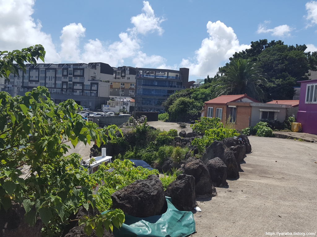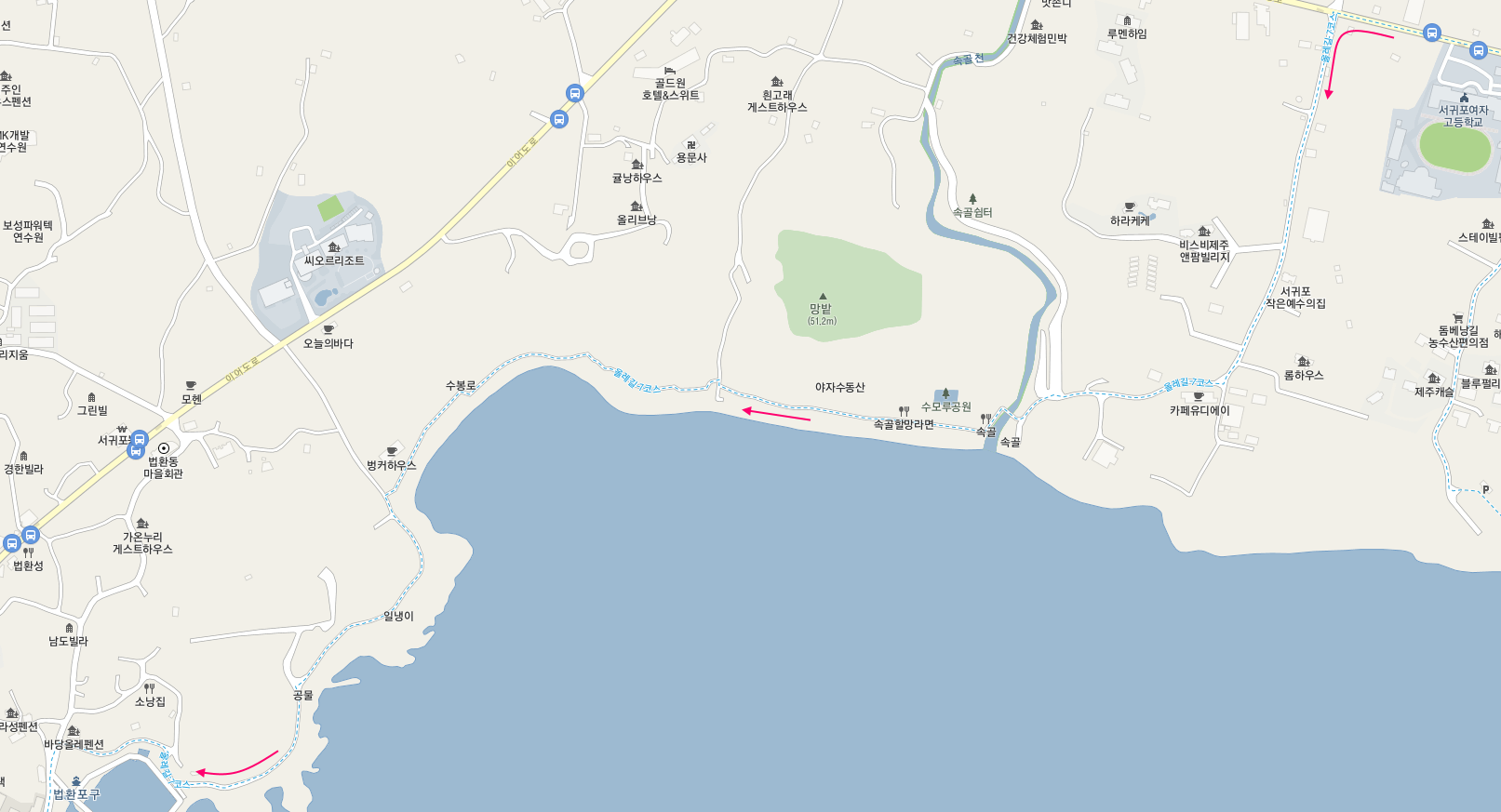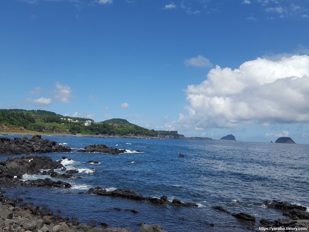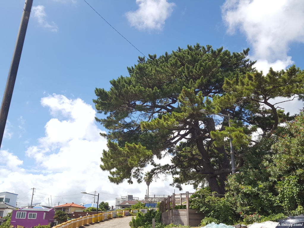 오전에 올레길 21코스를 끝낸 우리는 무더위에 파김치가 된 상태로 옆지기가 근처 편의점에서 구입한 음료수를 거나하게 들이켜고 종달 초등학교 앞 버스 정류장에서 201번 시내버스를 올라탔다. 긴 시간의 이동이니 만큼 급행을 타고 환승할까도 생각해 보았지만 조금 늦더라도 서귀포 여고까지 한 번에 갈 수 있는 방법을 선택했다. 거의 2시간에 육박하는 긴 이동 시간에 버스를 거칠게 모는 기사님 덕분에 깊은 잠을 자지는 못했지만 시원한 에어컨 바람을 맞으며 넉넉한 휴식 시간을 가질 수 있었다. 외국에서 온 것으로 보이는 두 여성이 우리 앞 좌석 앉았는데 우리의 땀냄새 때문이었는지, 아니면 우리에게 아직 식지 않은 열기가 풍기는 까닭이었는지 우리를 돌아보더니 자리를 옮겨 앉았다. 괜히 민폐를 끼치는 것 아닌가 싶었지만, 아무튼 좋은 휴식 시간이었다. 덕분에 가벼운 발걸음으로 올레길 7코스를 시작할 수 있었다.