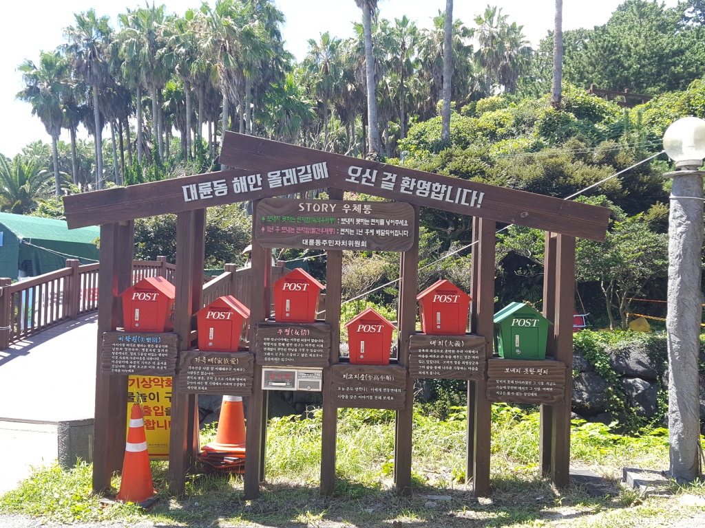 쭉쭉 뻗은 야자수들이 이국적인 분위기를 자아내는 대륜동 올레길에 들어선다. 입구에 있는 스토리 우체통 중에서 녹색 우체통은 받지 못할 이에게 붙이는 편지고, 나머지 미락원, 가족애, 우정, 지고지순, 대의라는 이야기가 있는 빨간 우체통에 엽서나 편지를 넣으면 1년 후에 편지를 부쳐 준다고 한다. 예전에 아이들과 함께 원동역에서 1년 후에 도착하는 엽서를 쓴 적이 있는데 실제 엽서를 받아보면 추억과 함께 감회가 새로웠었다.