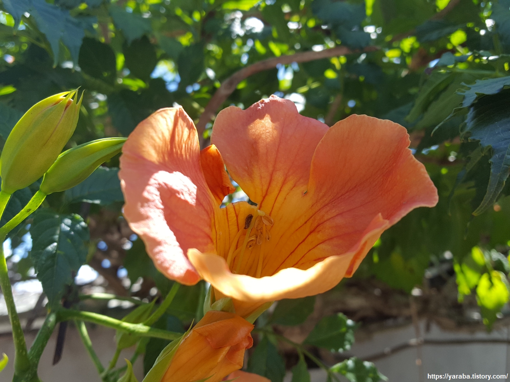 한 집에서 심은 능소화가 담을 넘어 길에서 아름다운 자태를 뽐낸다. 담쟁이 같은 덩굴성 목본 식물이다.