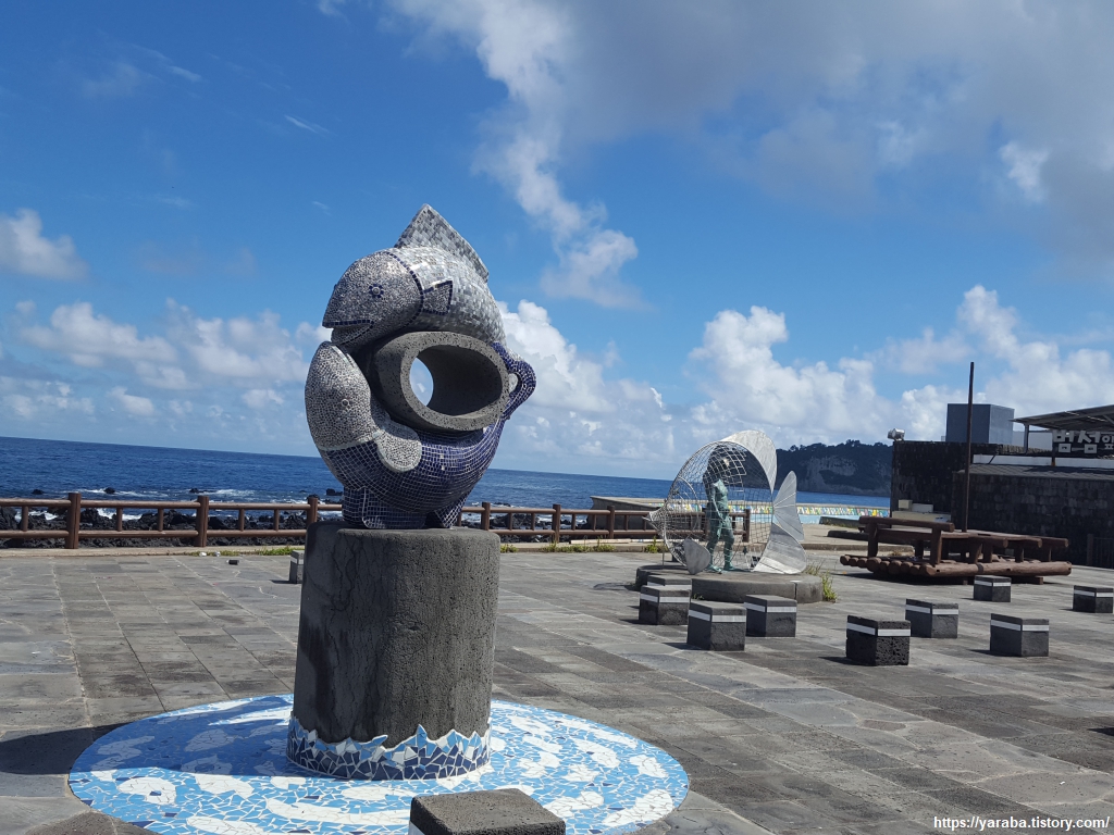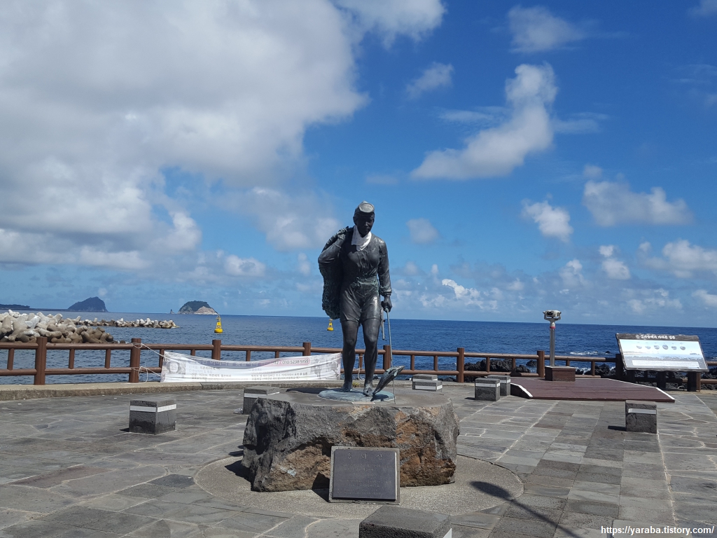 법환 포구 바로 옆에는 조각 작품들이 세워져 있는 법환 해녀 광장이 있었다. 올레길을 걸으며 여러 해녀상을 만나지만 가장 깊은 인상을 받은 해녀상이었다. 한 손으로는 테왁을 둘러메고 다른 한 손에는 물고기를 잡은 꼬챙이를 들고 있는 옛 해녀옷을 입은 강인한 모습의 해녀상이었다. 누군가 목에 걸어준 손수건도 인상적이었다.