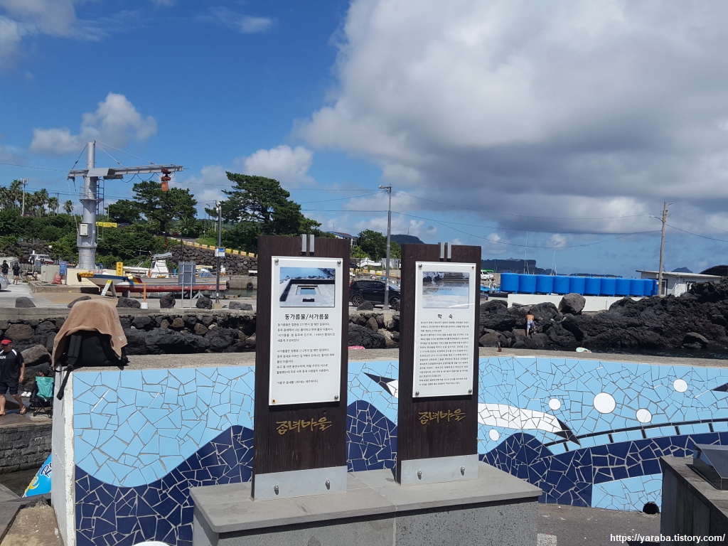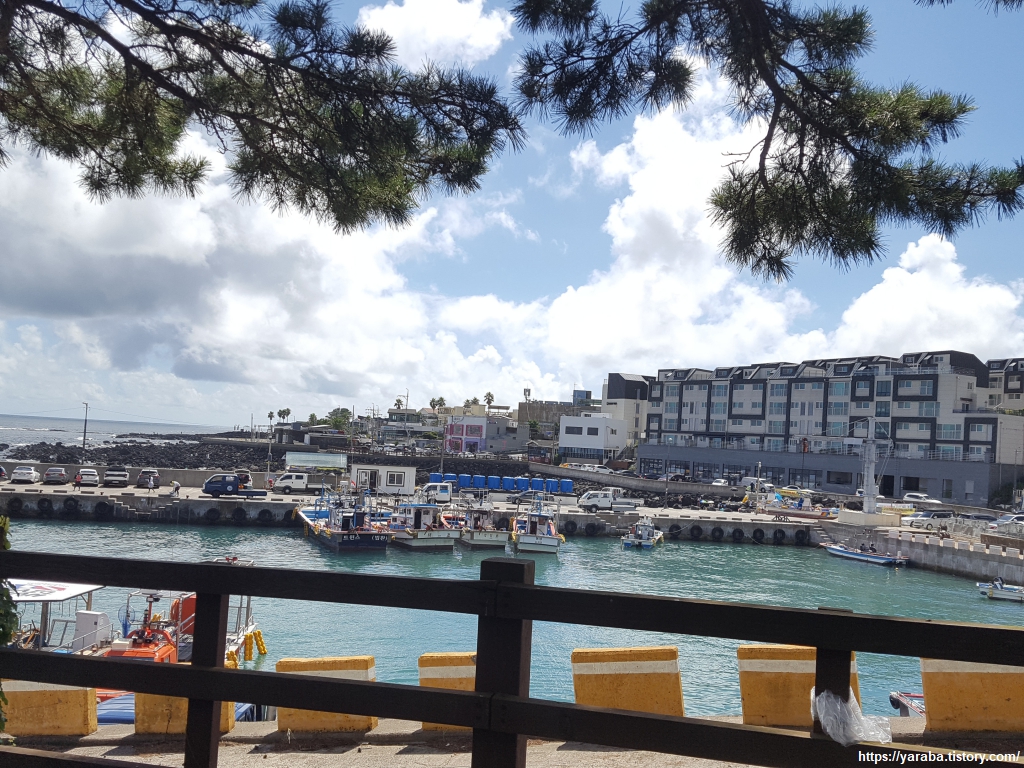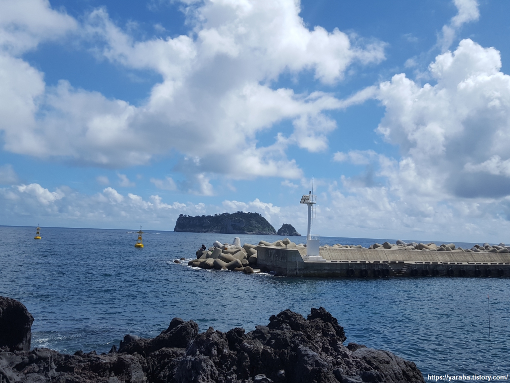 범섬 앞으로 시야를 가리는 긴 방파제가 법환 포구에 다가왔음을 알려준다.