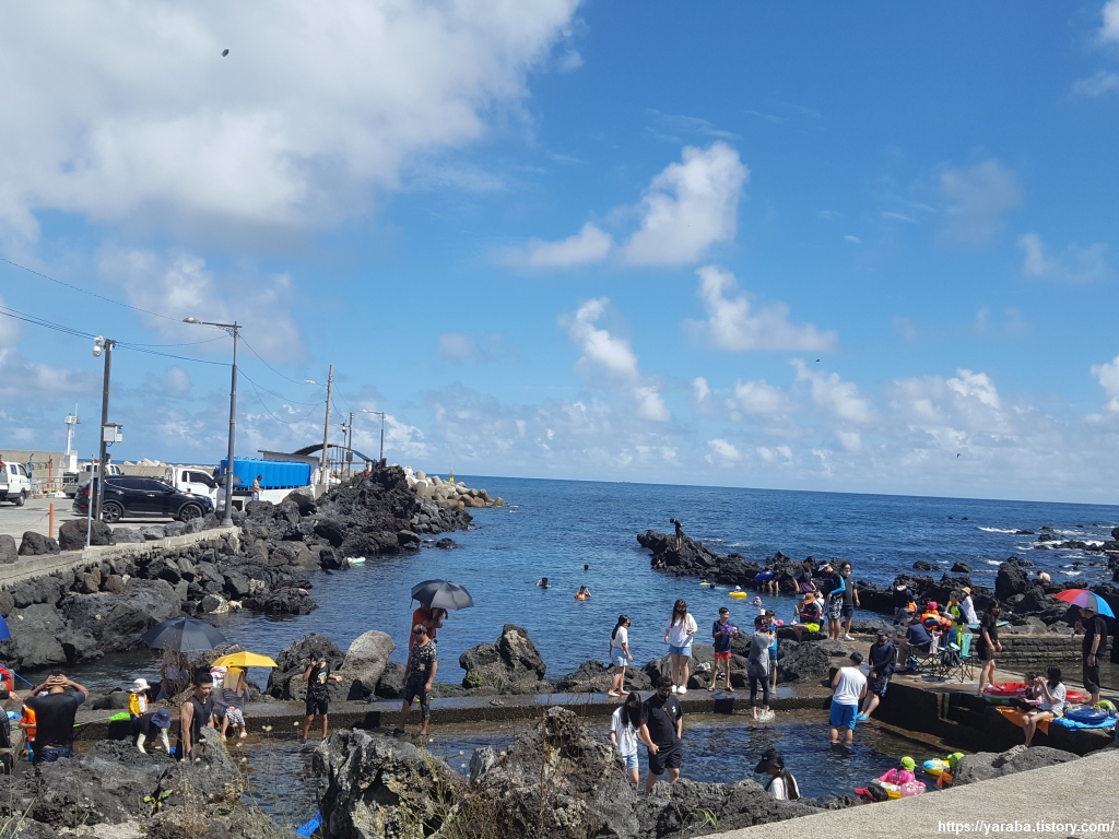 법환 포구 옆 동가름물/서가름물에서는 독특한 풍경이 벌어지고 있었다. 예전 같으면 마을 주민이나 수많은 고려 병사들이 식수로 사용했을 용천수에서 사람들이 신나는 물놀이 삼매경에 빠져 있었다. 나도 바로 들어갔으면 하는 마음이 굴뚝같았다. 가름은 마을을 의미하는 제주 방언이라고 한다.