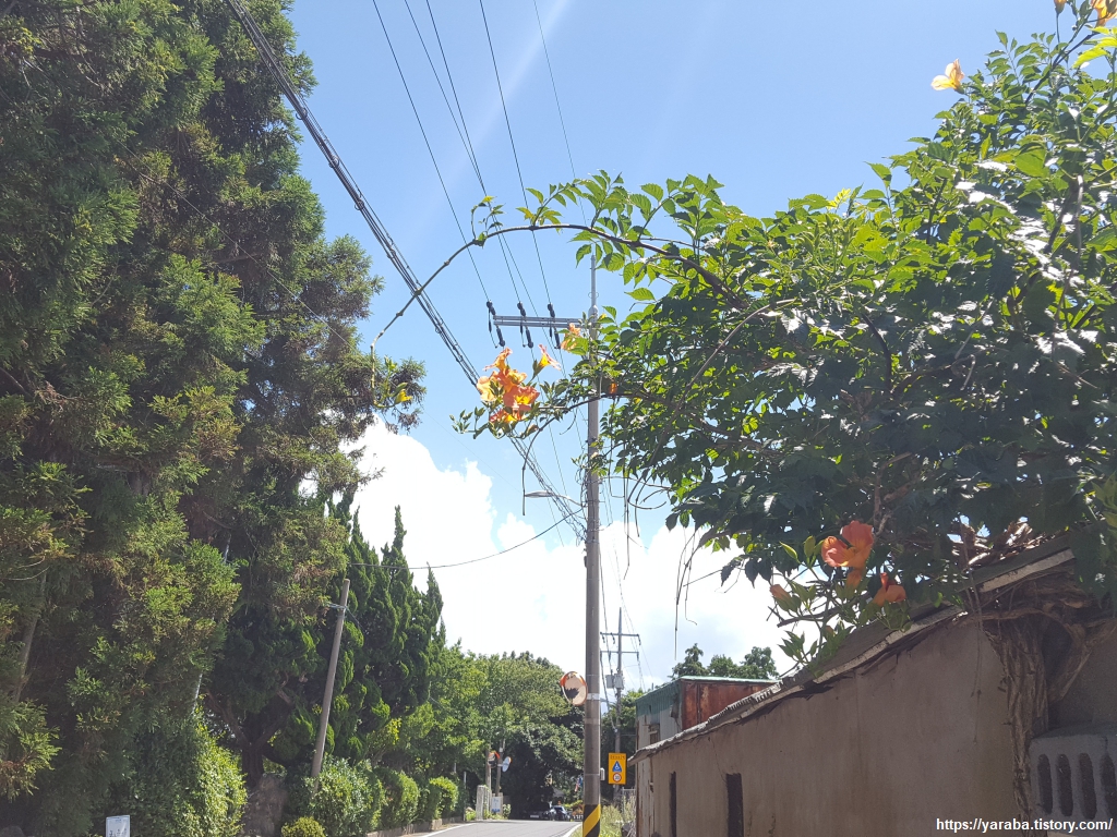나무들이 병풍처럼 둘러 있는 길이 반가운 것은 좁지만 그늘이 있다는 것, 나무 병풍 옆으로 바싹 붙어서 햇빛을 조금이나마 피해 본다.