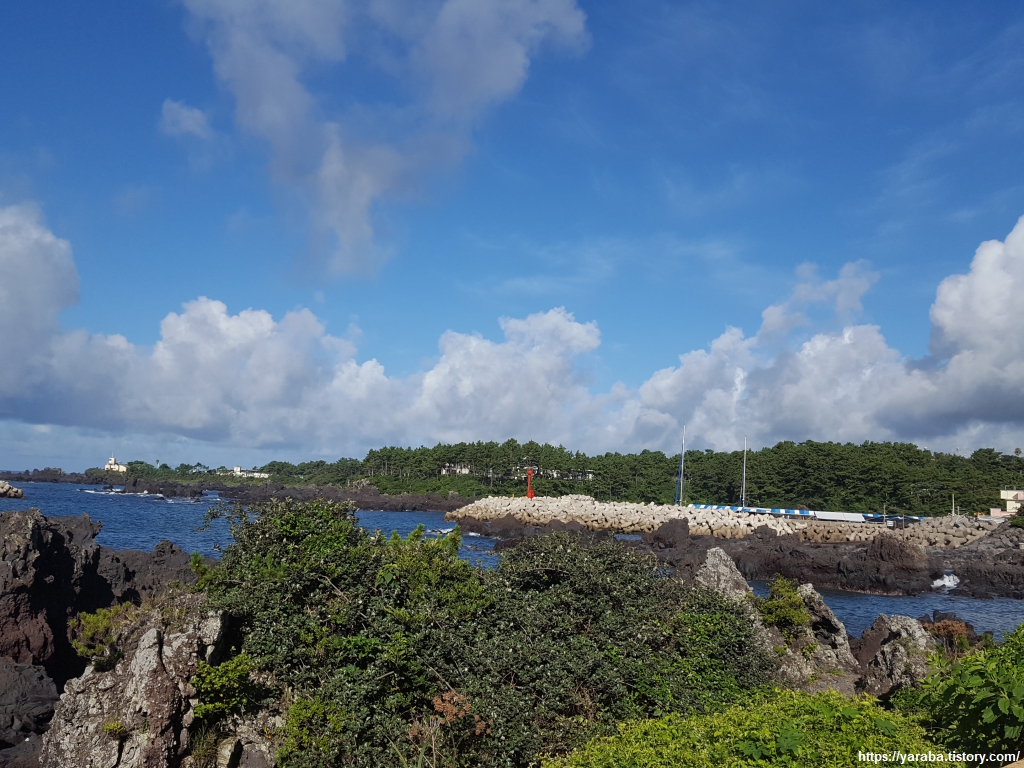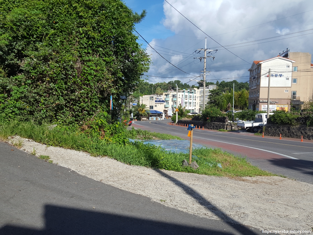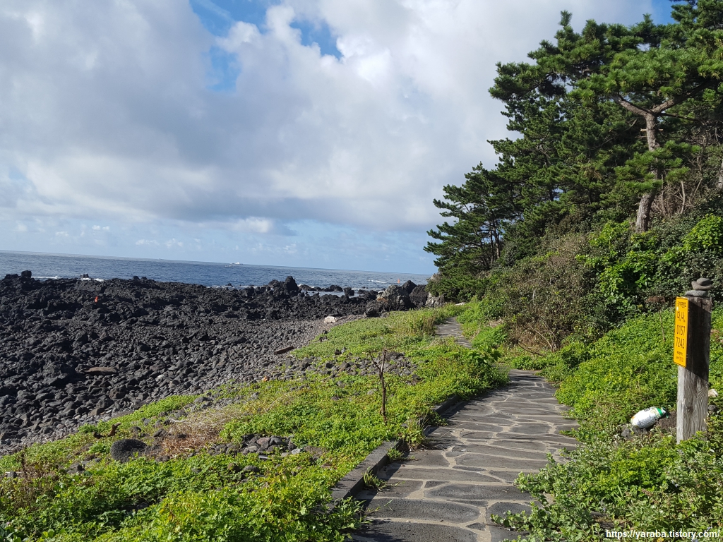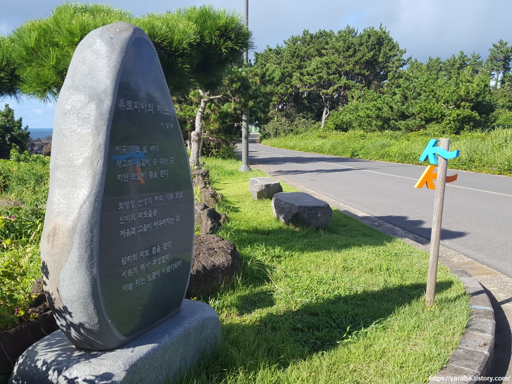 큰 규모를 가진 카페 우측을 지나면 중문 단지 축구장으로 이어지는 도로를 만난다. 도로 옆에 세워진 시비에 새겨진 이양우 님의 "유토피아의 해변"이라는 시가 있었는데 이곳 이후로 이어지는 절경을 제대로 표현한 것이다 싶다.