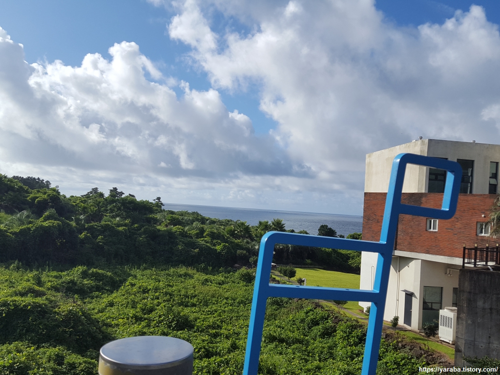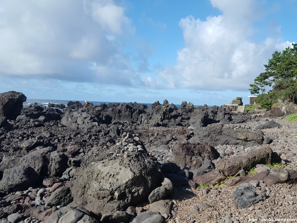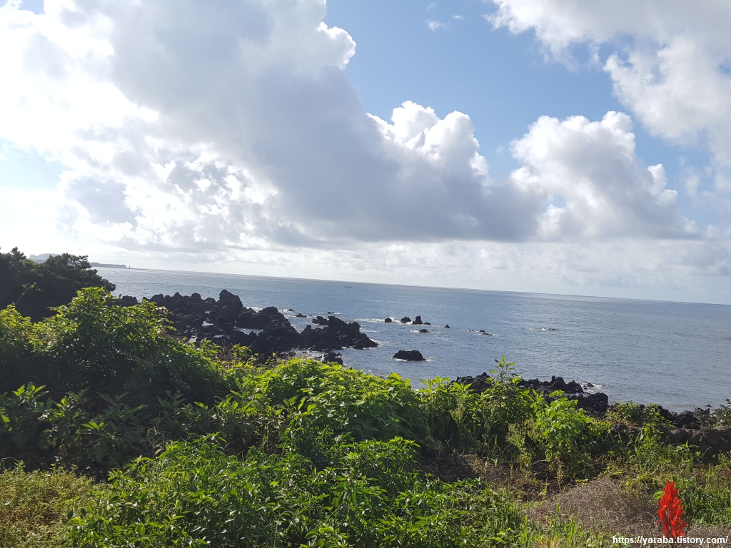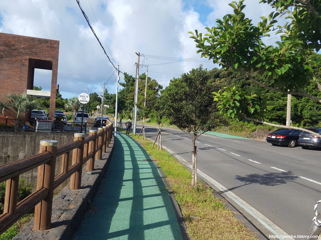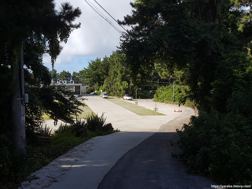 큰 규모를 가진 카페 우측을 지나면 중문 단지 축구장으로 이어지는 도로를 만난다. 도로 옆에 세워진 시비에 새겨진 이양우 님의 "유토피아의 해변"이라는 시가 있었는데 이곳 이후로 이어지는 절경을 제대로 표현한 것이다 싶다.