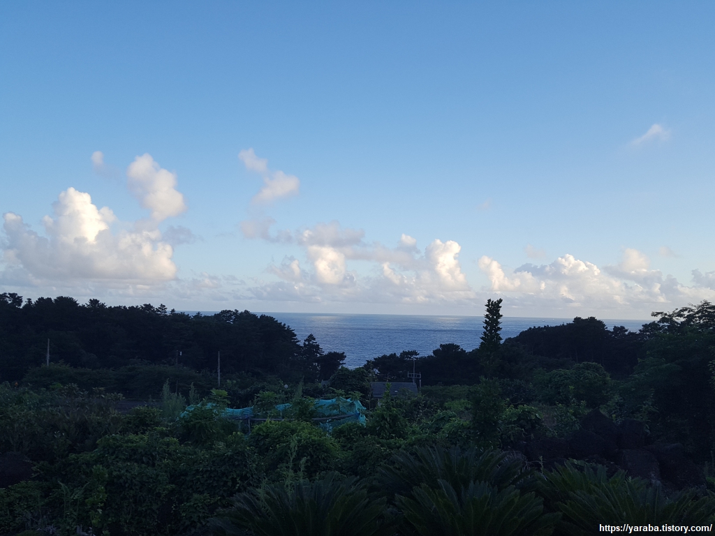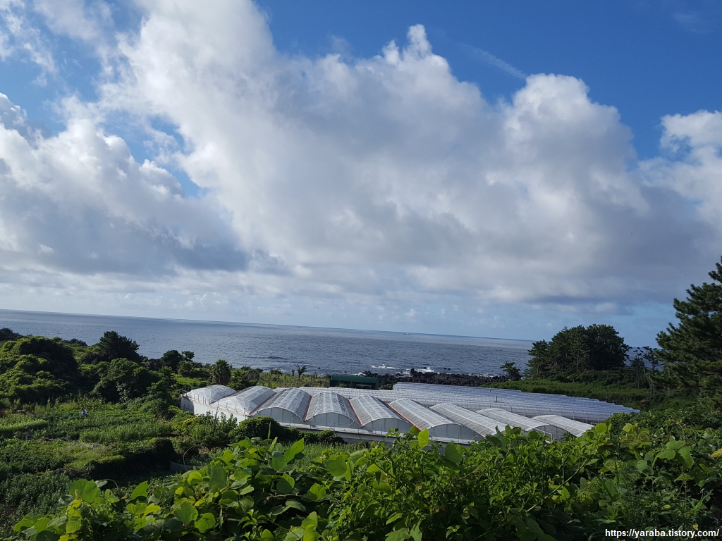 월평 아왜낭목 쉼터에서 잠시 숨을 고른 우리는 올레 8코스 초반에 있는 숙소를 향해서 부지런히 걸음을 옮긴다. 월평 마을에서 바라본 바다 풍경은 저녁 7시를 바라보는 시각이지만 흰구름은 여전히 석양에 빛나고 있다. 월평 하원로에서 약천사 쪽으로 좌회전한다.