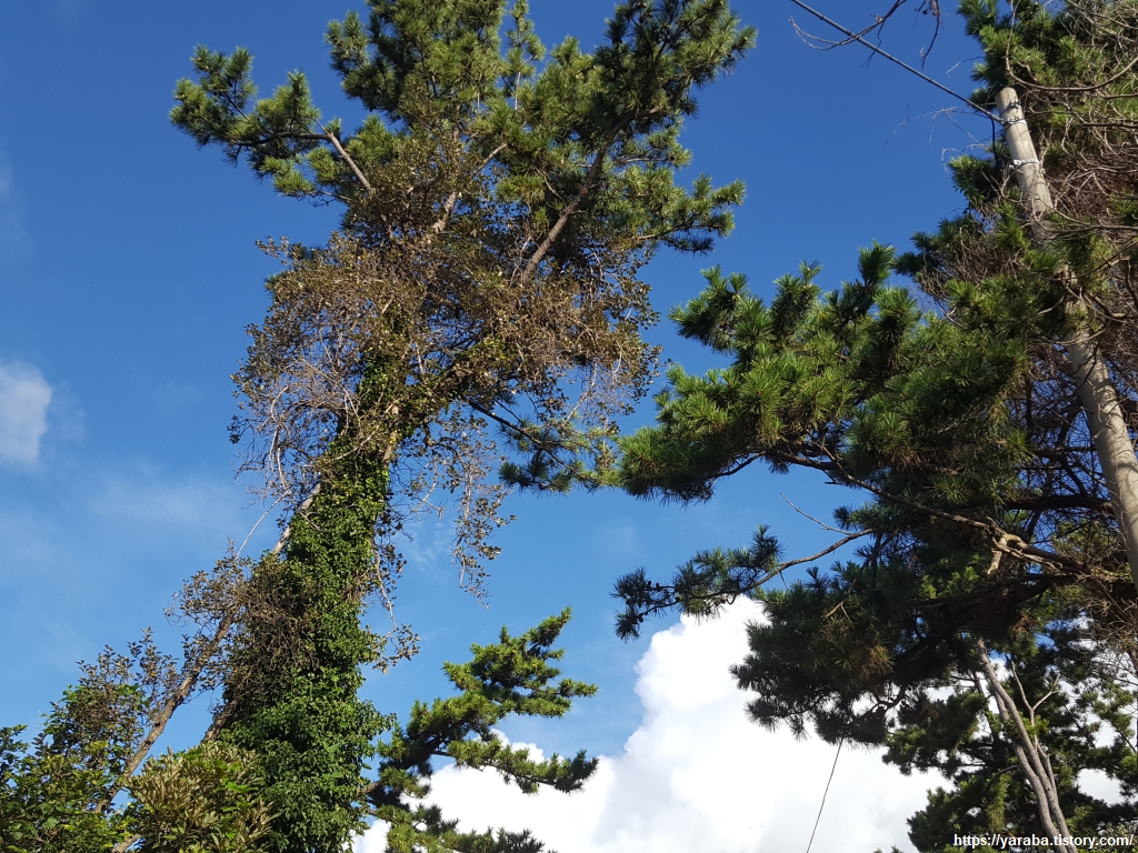 해안을 돌아 내륙으로 나가는길, 대포 포구의 방파제가 시야에 들어온다. 키가 큰 소나무와 소나무를 감싸며 올라가는 덩굴이 연리지처럼 하나의 나무처럼 보인다. 달리 보면 소나무는 "따라오고 싶으면 따라와!" 하며 키를 키우면서 달아나고, 덩굴은 스토커처럼 따라붙지만 소나무 잎 때문에 더 이상 위로는 올라가지 못하는 형국처럼 보이기도 한다.