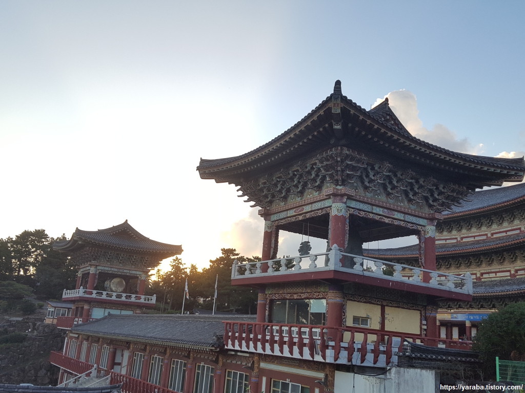 사찰에서 해변 쪽을 바라본 풍경. 막힘 없이 뻥 뚫린 전경이 훌륭하다. 앞으로는 바다를 바라보면서 사찰 양쪽으로는 회수천과 동회수천 계곡이 흐르는 곳이니 명당이라 할만하다.