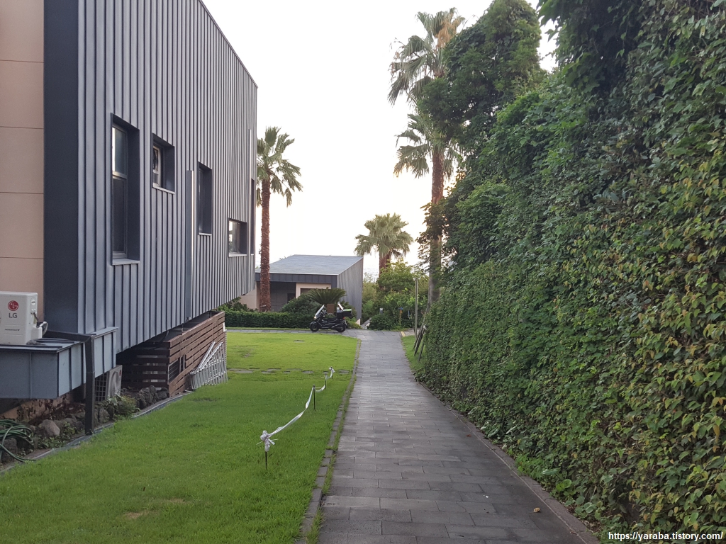 약천사 서쪽으로 흐르는 회수천을 건너 대포동 마을길을 지나 미리 예약해 놓은 숙소에 도착한다. 뷰티플 하우스라는 펜션에서 하룻밤 쉬어간다. 밤에도 푹푹 찌는 열대야 속에서 에어컨과 선풍기를 돌리며 넉넉한 휴식 시간을 가졌다. 올레 21코스와 7코스 절반과 8코스 일부까지 걸은 강행군 속에 무사히 하루를 마무리할 수 있어서 다행이었다.
