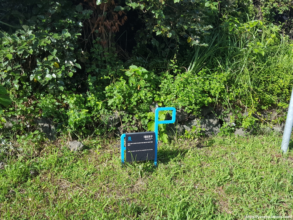 "이어도로" 도로변을 걷던 올레길 8코스는 해안 쪽으로 좌회전하여 마을길과 농로를 지나 해안으로 나간다. 해안가 몽돌길, 바위길을 한 바퀴 돌아 다시 대포 포구 인근의 "이어도로" 도로변으로 나온다.