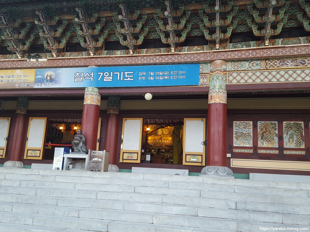 숲길을 지나 약천사 경내로 들어오니 상당한 규모의 사찰이 우리를 놀라게 한다. 신라, 고려, 조선 시대와 같은 역사적 배경은 없지만 많은 사람들이 물을 마시고 병이 나았다는 약수가 있는 절이라고 약천사라 부르게 되었다고 한다. 1981년에 세워진 사찰이다.