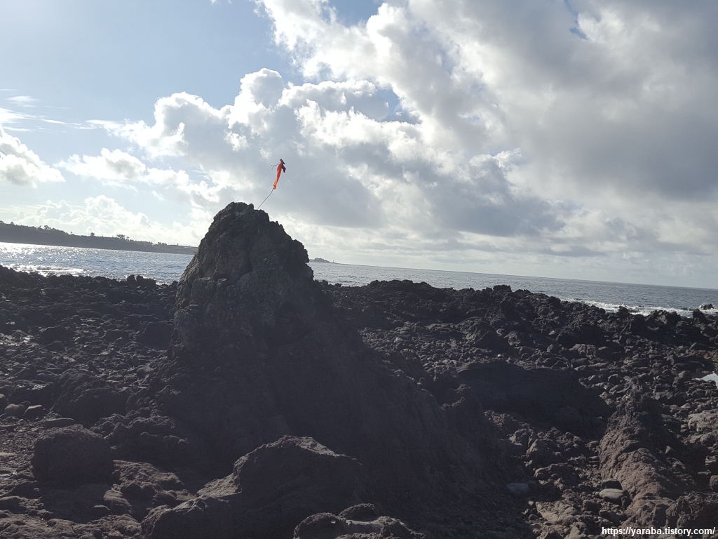 갯바위에 꽂아 놓은 올레 리본을 지나니 올레 8코스 19.6Km 중에 3Km 지점이라는 표식이 나온다. 아직도 16.6Km나 남았다. 거리만 보면 정말 아찔한 거리다. 8코스를 끝내고 9코스까지 걸을 예정이니 얼마나 남았는지를 생각하면 도움 될 것이 없다.