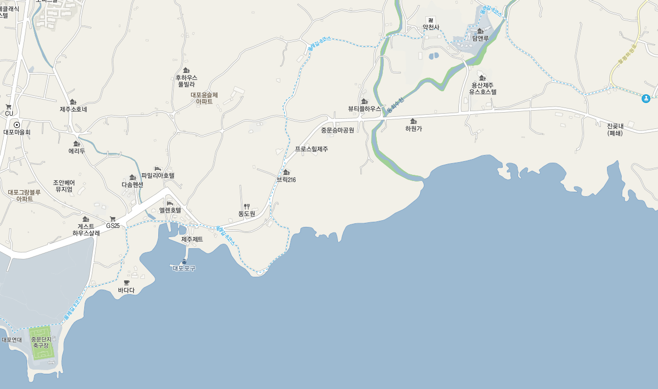 월평 마을을 떠난 올레 8코스는 약천사를 지나서 길 근처에 있는 숙소에서 하룻밤 묵었다가 다음날 길을 이어간다. 대포 포구를 거쳐 중문 단지 입구에 있는 대포 연대에 이른다.