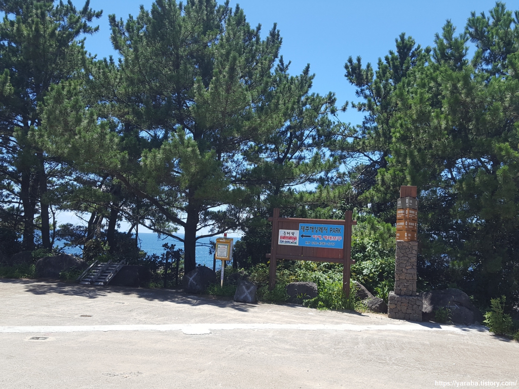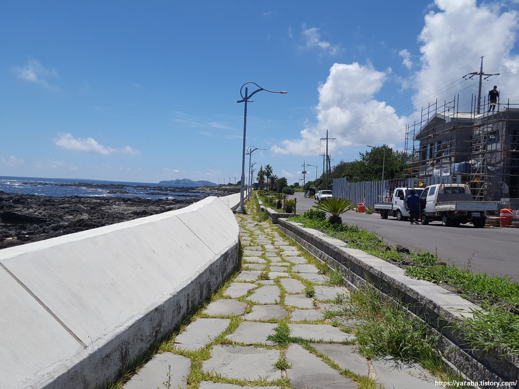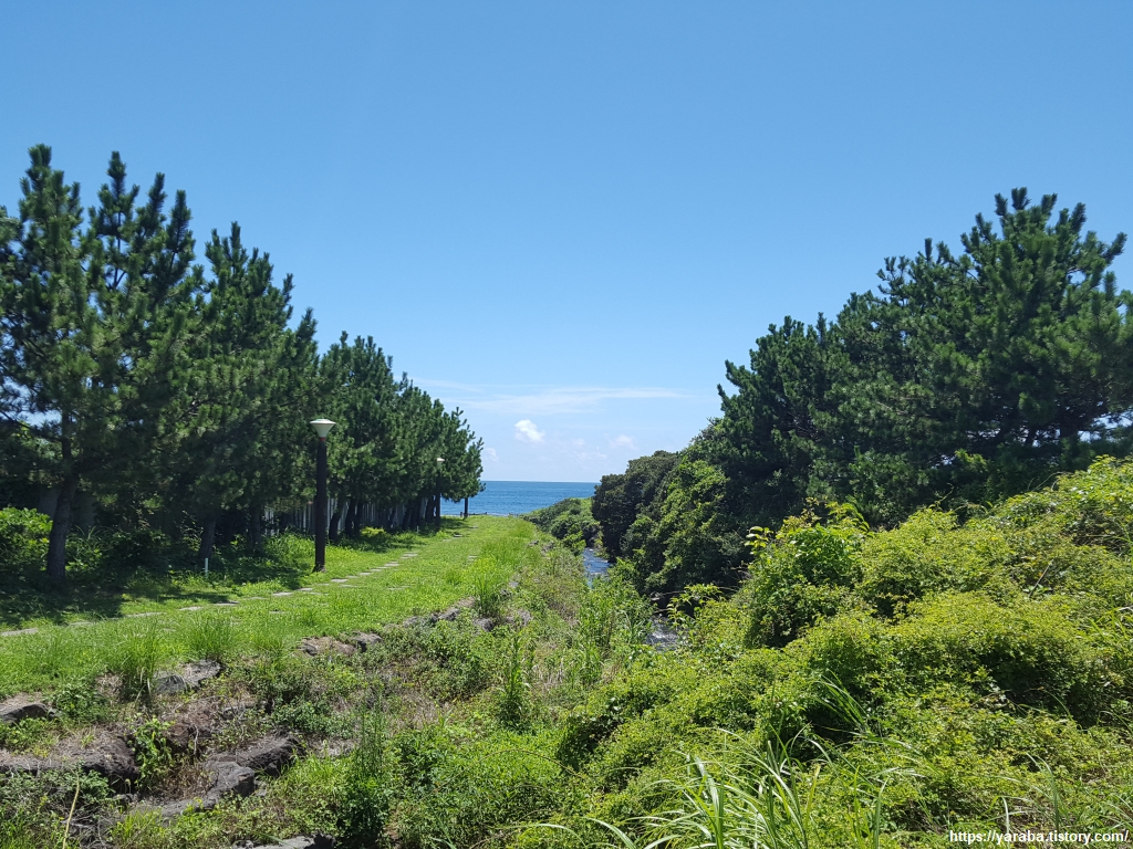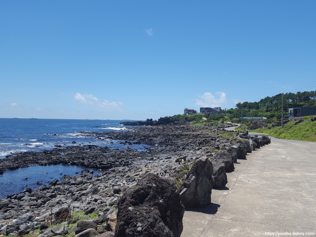 논짓물에서 대평포구까지 연결되는 해안로는 휠체어도 갈 수 있는 구간으로 평탄하게 이어진다. 평탄한 길을 푸른 수평선을 바라보며 걷는 길에서 유일한 장벽이라면 구름 한 점 없는 하늘에서 머리 위로 쏟아지는 햇빛이다.