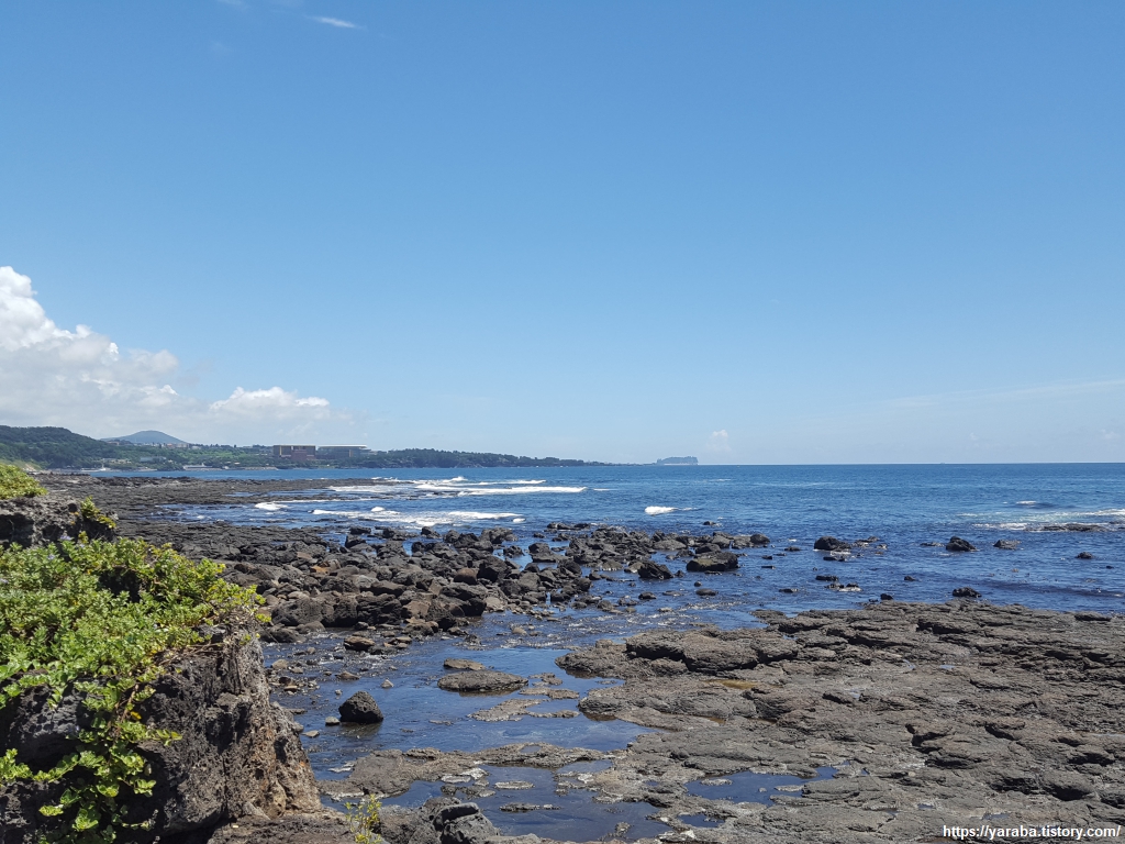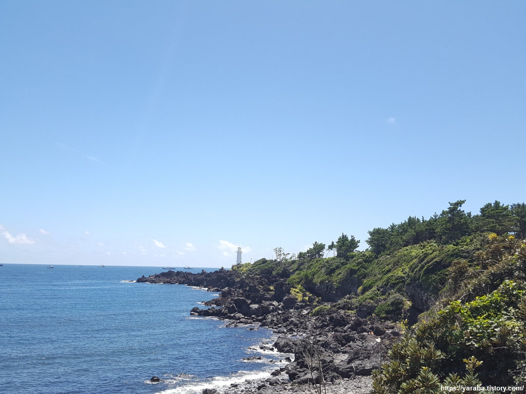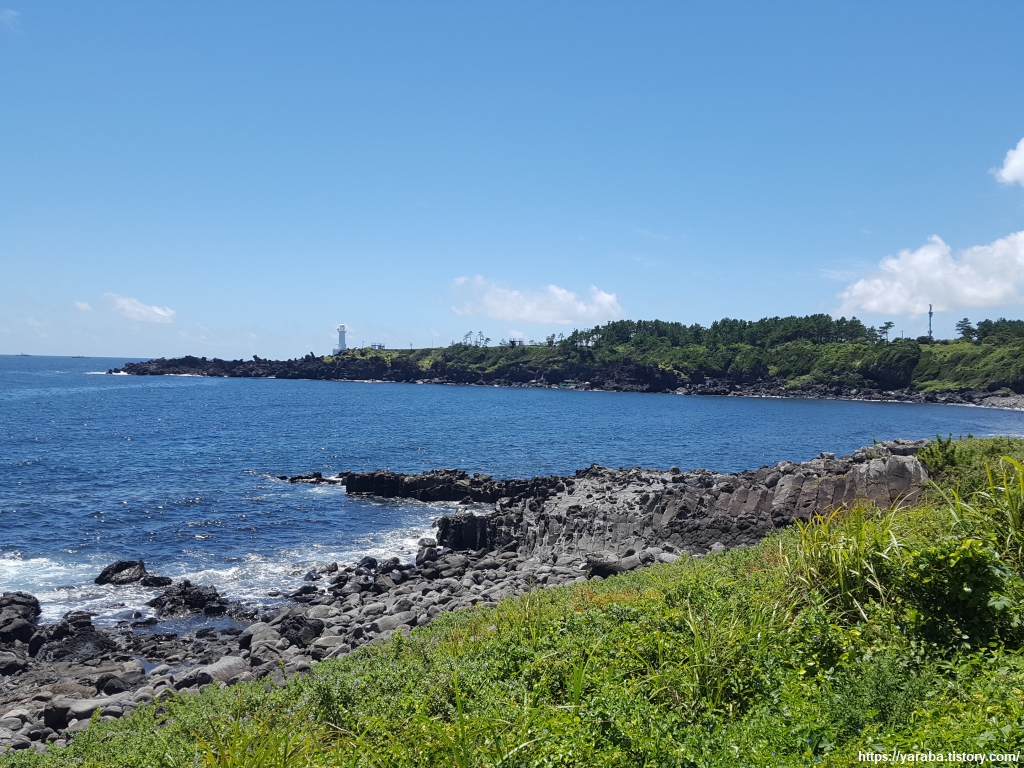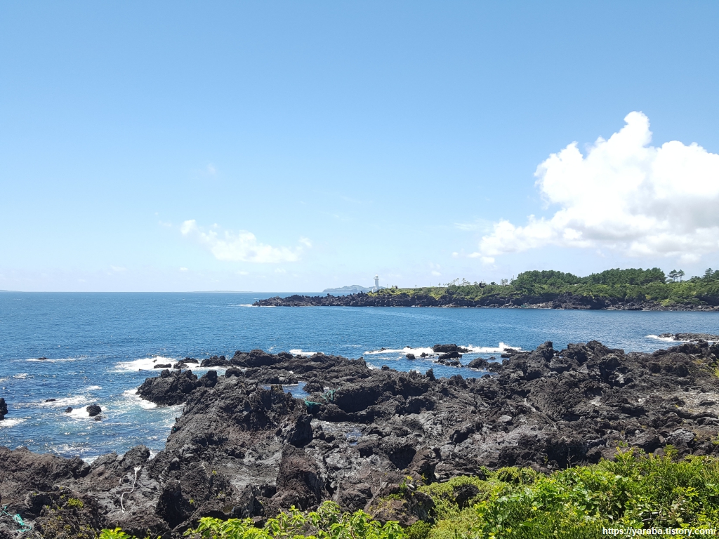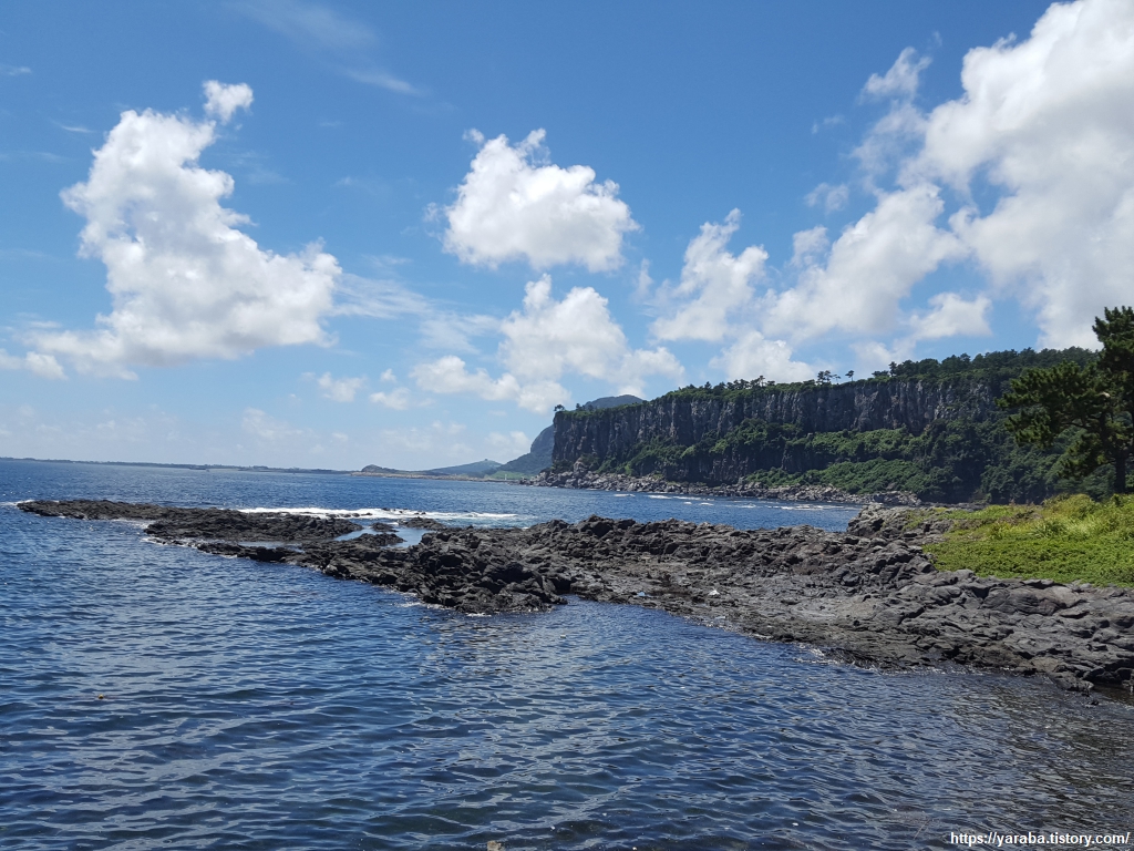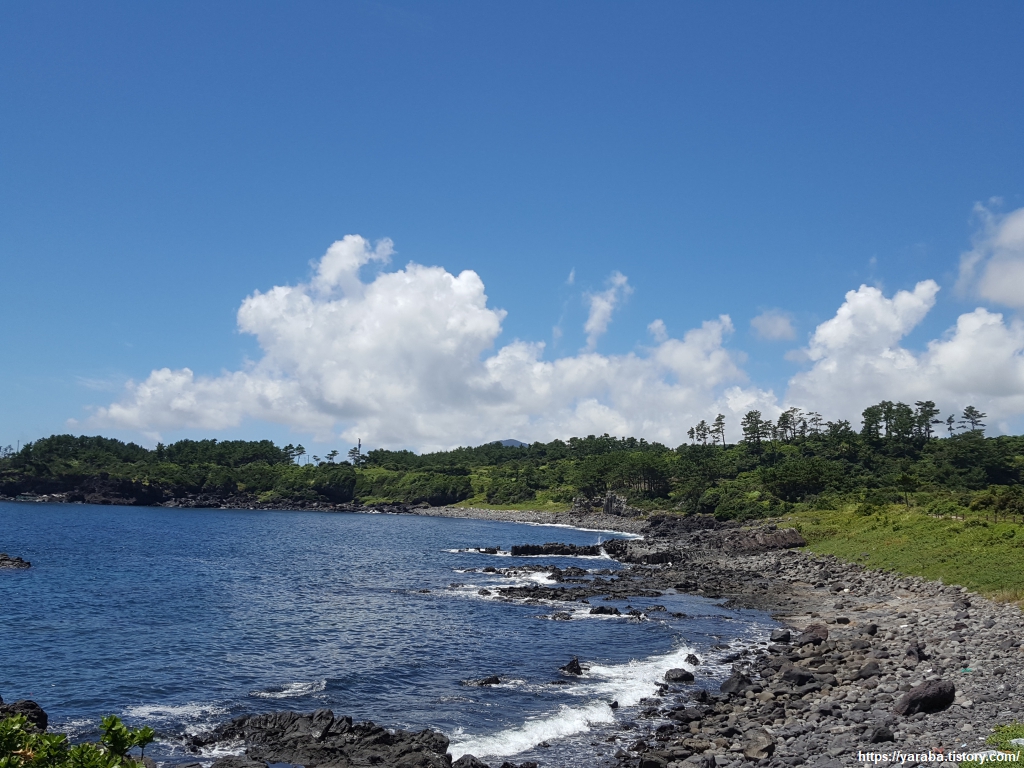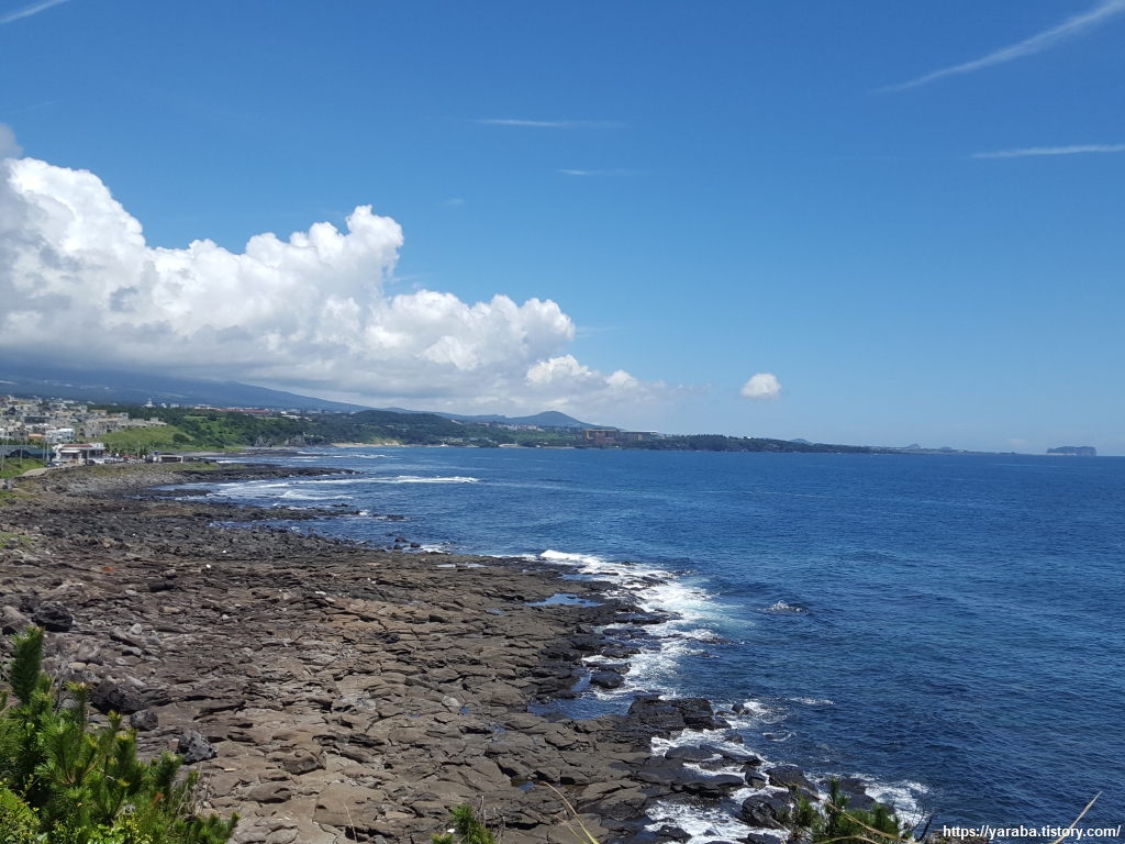 검은 바위의 해안선, 바위에 부딪히며 하얀 포말을 일으키는 시퍼런 바다, 햇빛을 받아 더욱 하얗게 보이는 흰구름과 파란 하늘 서귀포 바다는 정말 일품이다.