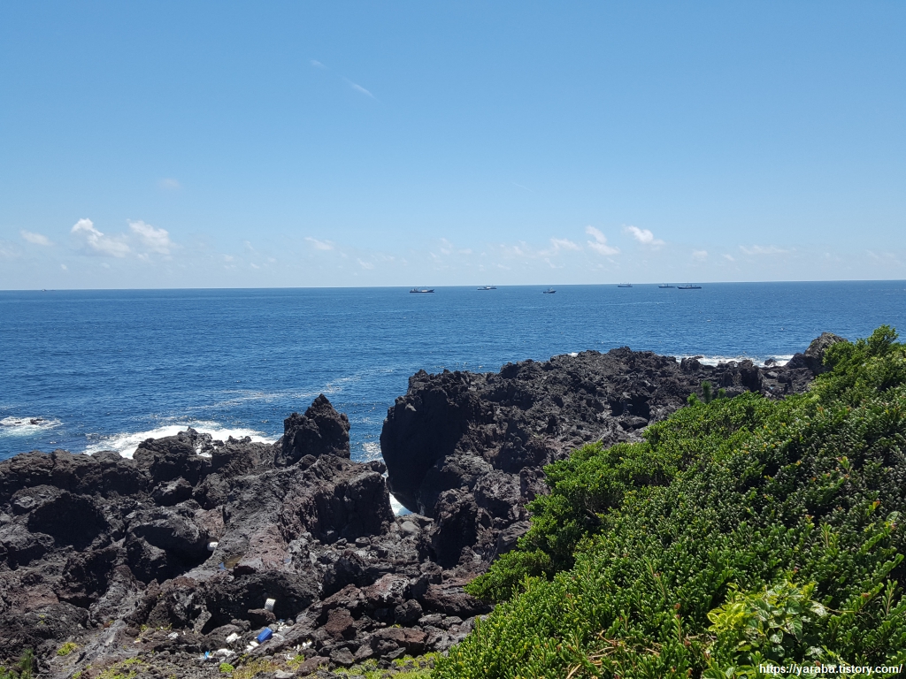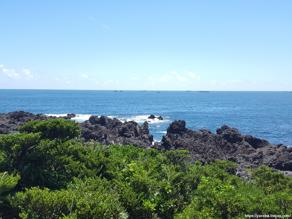 하예 포구로 향하는 예래 해안로는 기암괴석의 현무암 해변이 이어진다. 예래동 앞바다에서는 고깃배들이 유유히 조업에 한창이다.