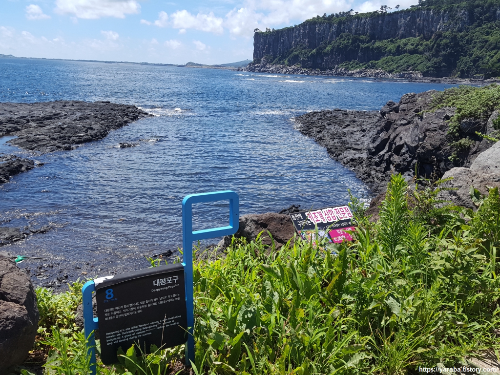 대평리는 넓은 들이라는 제주 방언 "난드르"라고도 불리는 마을이다. 올레길 8코스 종점이자 9코스의 시작점인 쉼터는 그늘에다가 넉넉한 공간으로 쉬어가기 좋았다. 화장실도 다녀오고 옆지기는 한동안 벤치에 누워서 이어서 걸을 올레길 9코스 걷기를 위한 충전을 했다. 땀 냄새를 맡고 날아온 모기만 아니면 더 쉬어갔었을 텐데 모기와 파리 때문에 휴식 시간이 그리 오래가지는 않았다. 대평 포구에는 스킨스쿠버 다이빙을 하고 온 한 무리의 사람들이 장비를 정비하느라 분주한 모습과 놀러 온 관광객들이 인증숏을 찍는 모습, 그리고 벤치에 덜렁 누워버린 올레꾼 두 사람, 손님을 내려준 다음 화장실 다녀와서 잠시 휴식 중인 택시 기사까지 바람이 솔솔 부는 가운데 평화로움이 넘친다.