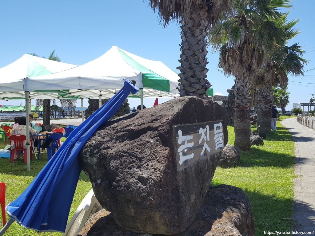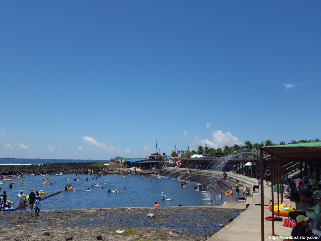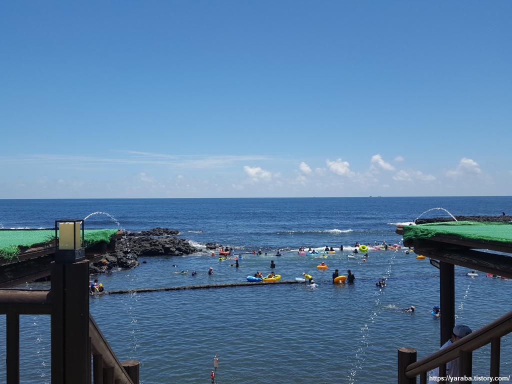 조금 걸어가니 많은 사람들이 모래 한 톨 없는 해안에서 물놀이 삼매경이다. 용천수와 바닷물이 만나며 훌륭한 천연 야외 수영장 역할을 하고 있는 논짓물이다. 그늘막 앞으로는 물줄기까지 뿌려대니 고급스러운 분위기의 휴양지 느낌까지 든다. 그늘막은 돈을 내야 하지만 입장은 무료다. 중간에 구역 경계선이 하나 있는데 구역 안쪽으로는 민물이 많고 경계 바깥으로 바닷물이 많고 깊이도 있다고 한다. 배낭 메고 땀 흘리며 걸어가는 입장에서는 그저 부러울 뿐이다.