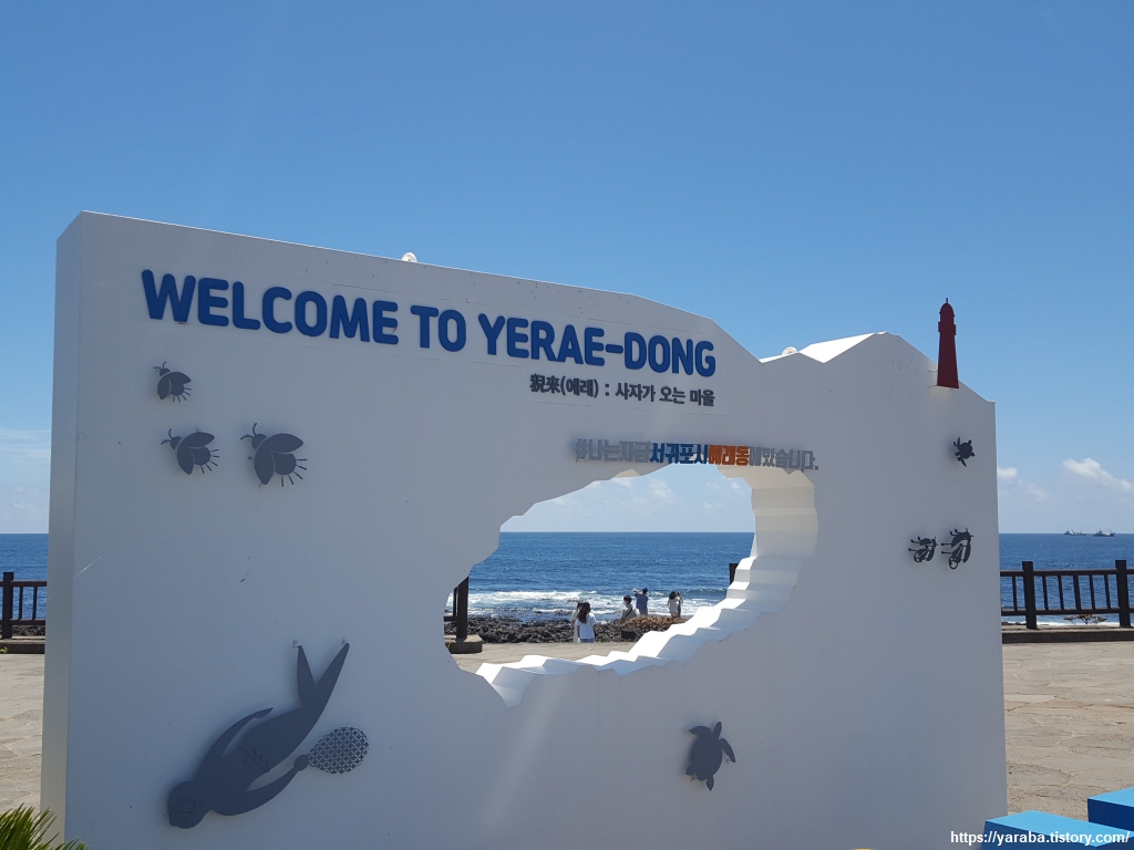 논짓물이라는 이름 때문에 이 용천수로 논농사라도 지었는가 싶었다. 그렇지만, "논다"라는 제주 방언은 그냥 버린다는 의미로 용천수가 너무 해안 가까이에서 솟아 나오기 때문에 농업 용수로도 식수로도 사용하기 어려워 그냥 버리는 물이라는 의미인 것이다. 지금처럼 여름이면 최고의 수영장 역할을 하니 그것만으로도 훌륭하다. 예래동을 알리는 조형물을 참 이쁘게 만들어 놓았다. 제주도 모양으로 구멍을 뚫었는데 예래동의 상징인 사자는 없다. ㅎㅎ