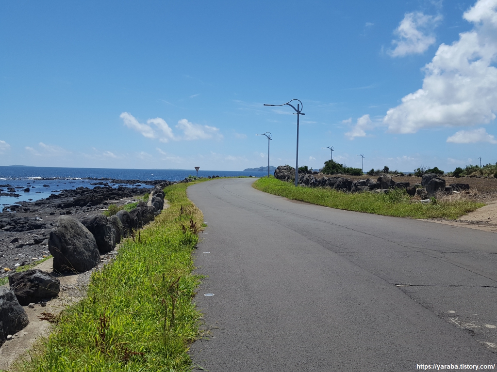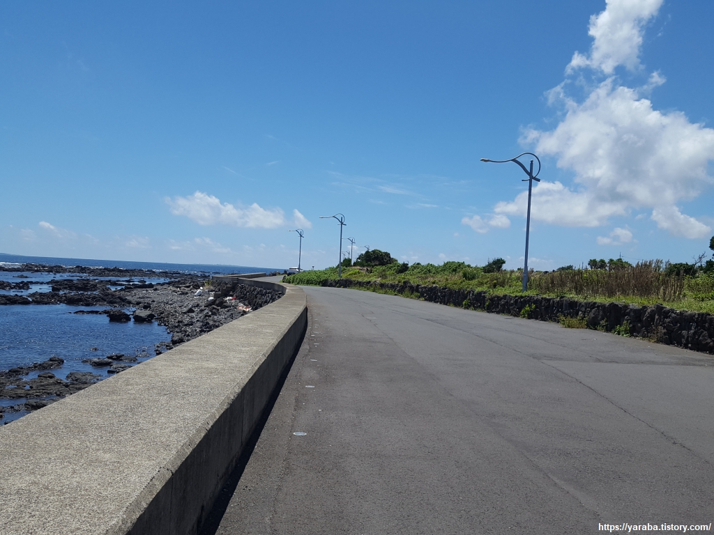 구름과 가로등 아래 말없이 걷는 길, 더위 속에서 걸으며 멍 때리기 하기 좋은 곳이다. 시야에 들어오는 것은 도로와 구름, 바다뿐이다.