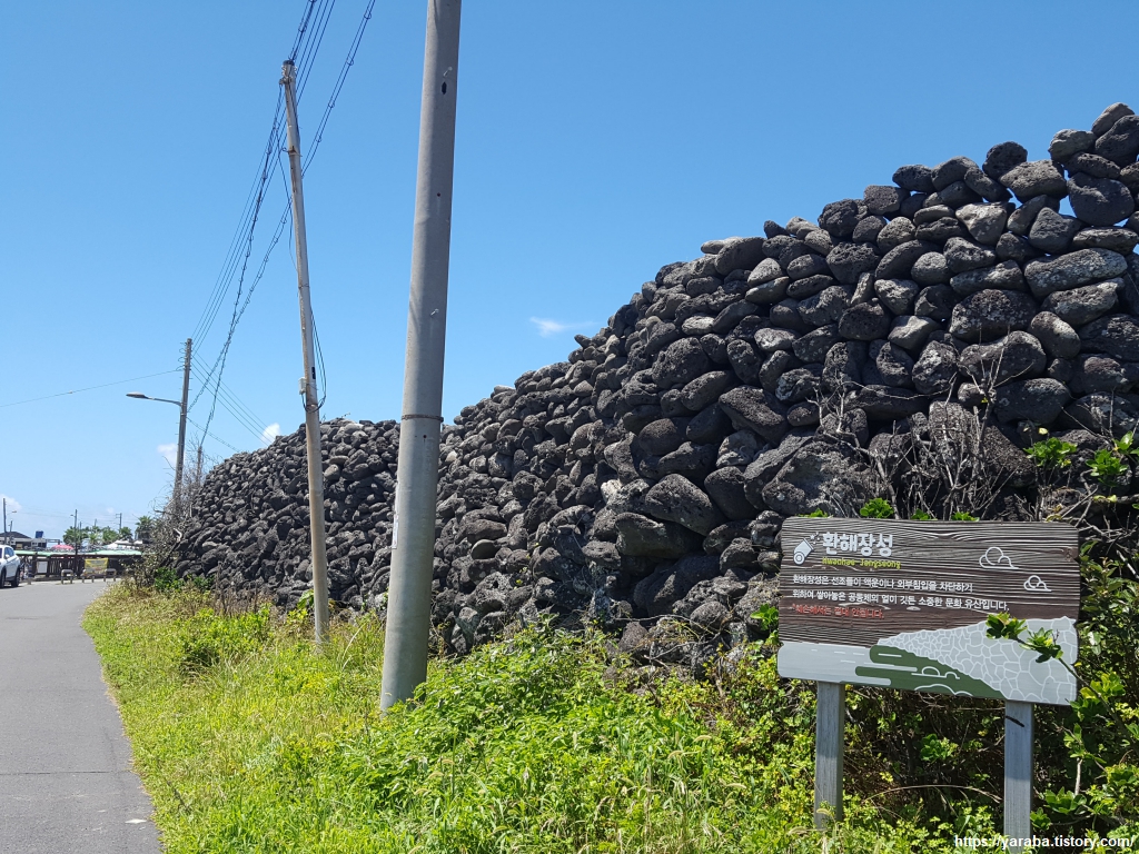 하예동 환해장성이다. 제주 해안 곳곳에 왜구를 막기 위한 환해 장성들이 있는데 기록으로는 고려 때까지 올라가지만 이곳의 환해장성은 조선 현종(1845년) 때 우도에 한 달간 정박하며 측량 작업을 했던 영국 선박의 출현이 계기가 되었다고 한다. 잉카의 마추픽추처럼 정밀하게 돌을 다듬은 것은 아니고 바닷가에서 파도가 동글동글하게 만들어 놓은 돌들을 높게 쌓았다. 제주 돌담들이 한 줄로 쌓아도 무너지지 않는 이유는 돌 사이사이에 있는 구멍이 바람길 역할을 하기 때문인데 저 동글동글한 돌들로 높은 성벽을 쌓았으니 당시 사람들은 얼마나 힘들고 짜증 났을까? 하는 상상을 해본다.
