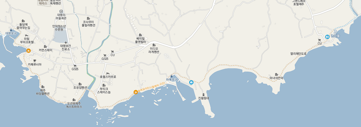대왕수천 생태 공원을 지난 올레 8코스는 논짓물을 지나 하예 포구를 거쳐 대평 포구에 이른다. 이 구간은 휠체어도 갈 수 있는 평탄한 구간이다. 예레 해안로를 따라 걷는다.
