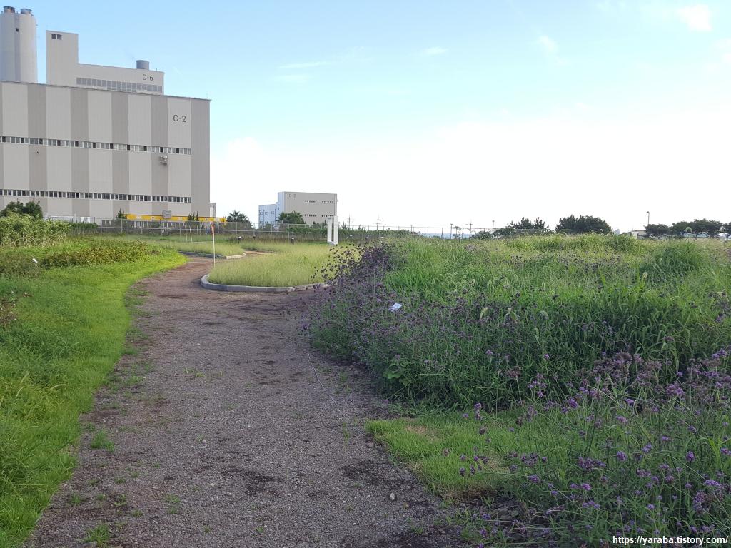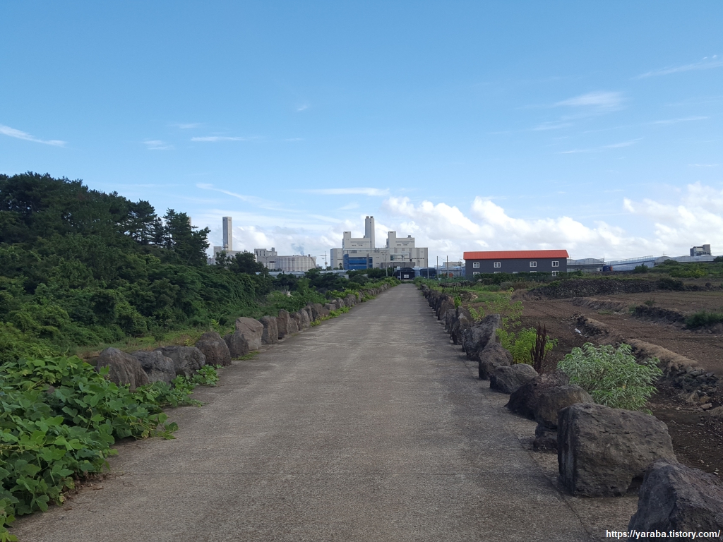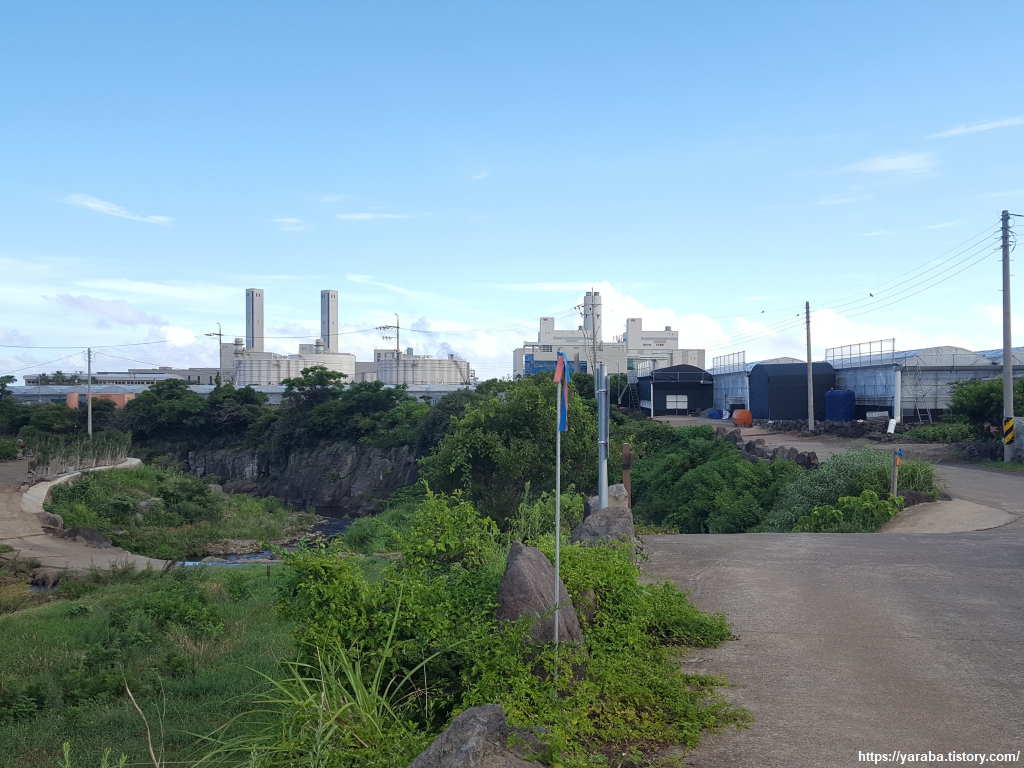 개끄리민교를 지나 좌회전하여 남제주 화력 발전소까지 계속 창고천변을 따라 걷는다. 아름다운 서귀포 해변에서 화력 발전소의 굴뚝을 처음 만났을 때는 그야말로 충격이었다. 개인적으로 전력의 상당 부분이 육지에서 오는 것으로 오해하고 있었기 때문이기도 했지만 환상적인 박수기정과 산방산 사이로 화력 발전소의 굴뚝이라니, 말이 나오지 않았었다. 재생 에너지의 발전량이 수요를 초과해서 2015년부터 풍력 발전의 출력 제한을 실시하고 있다는 뉴스를 종종 접했던 까닭도 있었을 것이다. 실제로 2020년 기준으로 제주의 신재생 에너지의 발전량은 정격 용량의 57%에 이른다고 한다. 아무튼, 전력 수급상 어쩔 수 없는 부분을 논하기에는 무리가 있고 제주에는 이곳의 남제주 화력과 함께 제주 북부의 제주 화력, 한림 복합 화력 발전소가 있다고 한다.