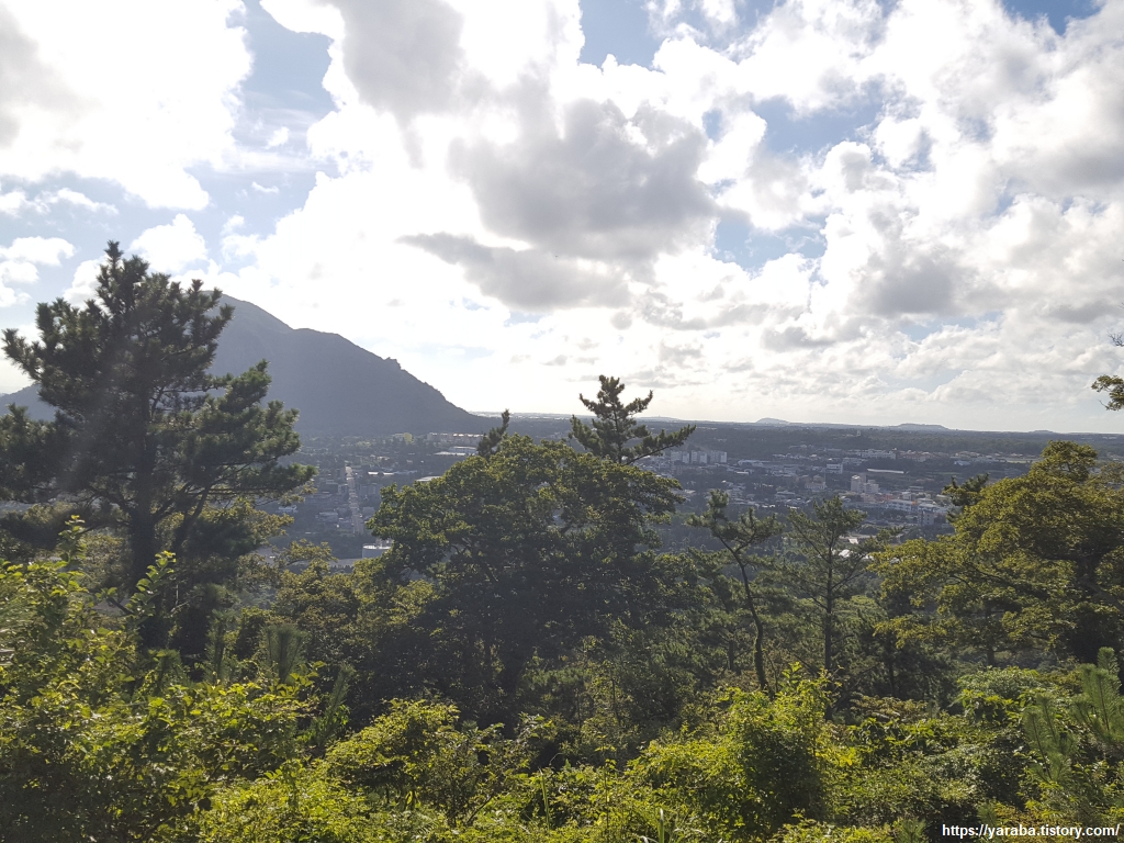 하산길에 바라본 풍경 산 아래로 산방산과 화순리 마을 풍경을 보면서 걸어 내려간다.