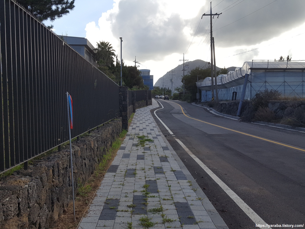 월라봉 입구를 지나 산방산을 바라보면 창고천을 향해서 내리막길을 걷는다.
